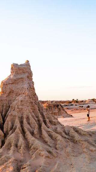 You’ll want to hit the road early today, as we explore the wide-open spaces of Mungo National Park, a traditional meeting place and spiritual site for the Muthi Muthi, Nyiampaar and Barkinji Nations, Indigenous Peoples who have been living in the area for more than 40,000 years. Long ago in that history, this otherworldly spot was a fertile lake where humans and prehistoric mammals roamed side by side. Since then, the landscape has become a surreal desert topography, punctuated by lunettes, the eroded remnants of sand dunes, some towering up to 40m in height.