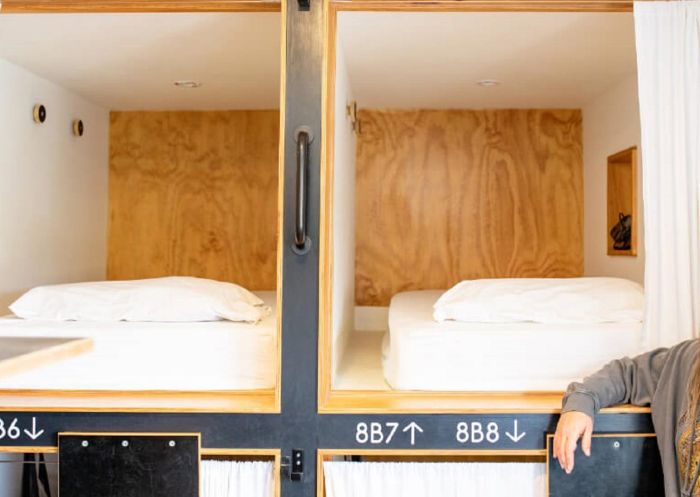 A friendly hostel in the centre of Woolgoolga, Woopi Backpackers is a great spot to meet fellow travellers. Stay in modern and clean dorm rooms with pods or private rooms with beds, and relax in the common areas, with a pool table, TVs with Netflix and Xbox, a library, board games, musical instruments and more. Cook meals in the fully equipped kitchen, or outside in the courtyard on the barbecue. Eco-conscious travellers will love the building which has been sustainably built, with upcycled décor, solar power and a minimal carbon footprint.