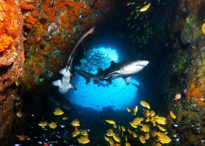 It’s not just the adrenaline rush of diving through a narrow sea cavern that makes this dive exciting - it’s the abundance of life within. In the cave, you’ll glimpse crayfish and moray eels peeking out from crevasses, while stingrays and wobbegong sharks blanket the floor, and fish of all colours, shapes and sizes surround you. At the entrance to The Aquarium, the silhouettes of several grey nurse sharks hove into sight as you exit the cave and ascend through enormous schools of big eyes and stripeys.