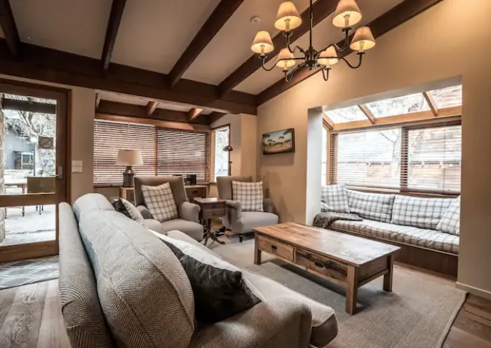 For groups that enjoy the finer things in life: enter Après Vous Apartment with its Scandi-style monochrome palette, premium furnishings and luxe amenities like Aesop and Hunter Lab products, coffee machine, Marshall Bluetooth speaker and bar cart primed for après ski. This chic stay in Thredbo sleeps six people and is a short stroll from the village hub. Meanwhile, The Bastion is the type of place you can live out your European snow fantasies. Located between Thredbo and Jindabyne, with the Skitube railway only five minutes away, this hygge mountain house sleeps 10 guests, and has a warm design of dark woods and rich colours, with two fireplaces keeping things extra toasty. Kids will love sleeping in the room with four single beds, which makes a (very stylish) adult-free zone for fun-filled sleepovers.