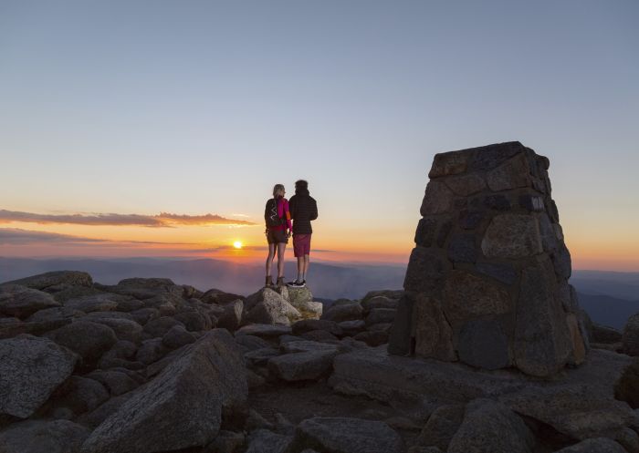 Couple watching the sun set at the summit of Mount Kosciuszko, Kosciuszko National Park