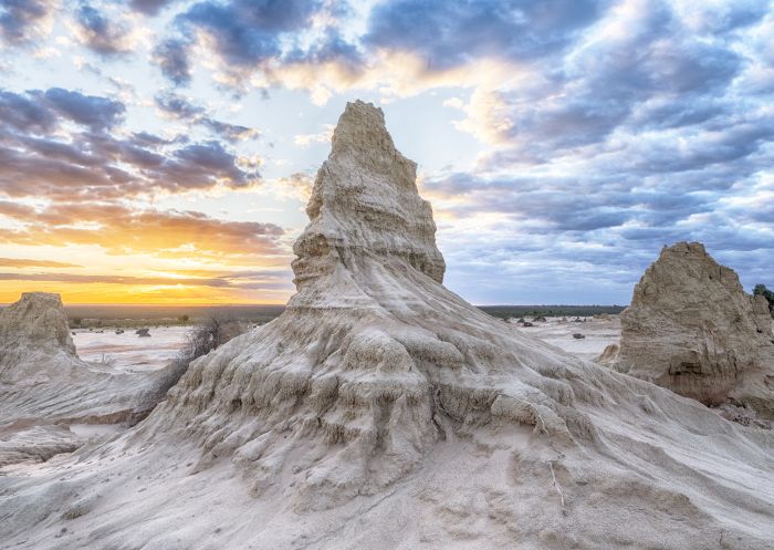 Easily the best way to navigate this magnificent destination is on the guided Mungo Walk the Walls of China Tour with an NPWS Aboriginal Ranger. With some over 40 metres in height, the astonishing pinnacles stretch in an arc for over 40 kilometres. You’ll learn about the immense cultural significance of this World Heritage-listed area, including the discovery of the 42,000-year-old remains of the Mungo Lady in 1968 and the Mungo Man in 1974. Found in a dried lakebed in the heart of the park, Mungo Lady and Mungo Man proved without dispute that Aboriginal people have walked these lands for tens of thousands of years.