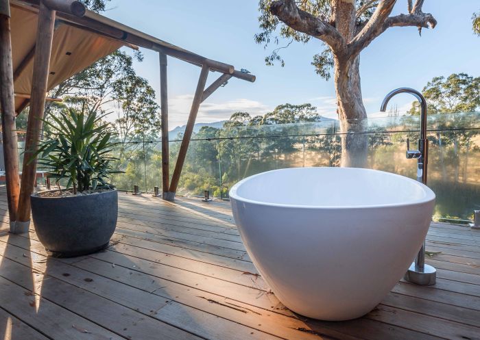 Things get snuggly on the Sapphire Coast when you stay at Currajong Retreat – not only are your digs located on a working angora goat farm, but you can meet them on a private tour during your visit. And then there’s the accommodation: three luxurious safari tents, each with a private deck and stunning views over the countryside. There’s every amenity you could want, from plush beds to a kitchenette, ensuite bathroom with waterfall shower and outdoor tub for leisurely soaks.