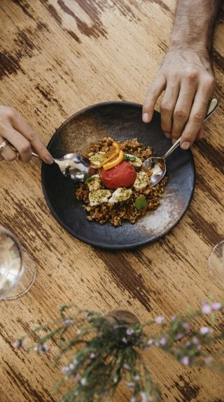 At Nimbo Fork Lodge, a sprawling estate between Gundagai and Tumut. Your early lunch here might be a serve of butterflied Nimbo trout or of coal-roasted mushroom risotto, and your view of lush emerald-green fields.
