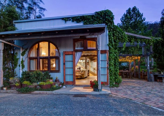 From an old farm to a thriving eco getaway, Broger’s End is a 65-hectare property set on Upper Kangaroo River, home to wild platypus. The old farm shed and dairy have been lovingly transformed into self-contained accommodation using reclaimed materials; both powered by solar panels and battery. Water use is 100% collected rainwater, food scraps are composted on site, and the organic gardens make for a living supermarket, filled with herbs, vegetables and fruits, with eggs from the chickens.
