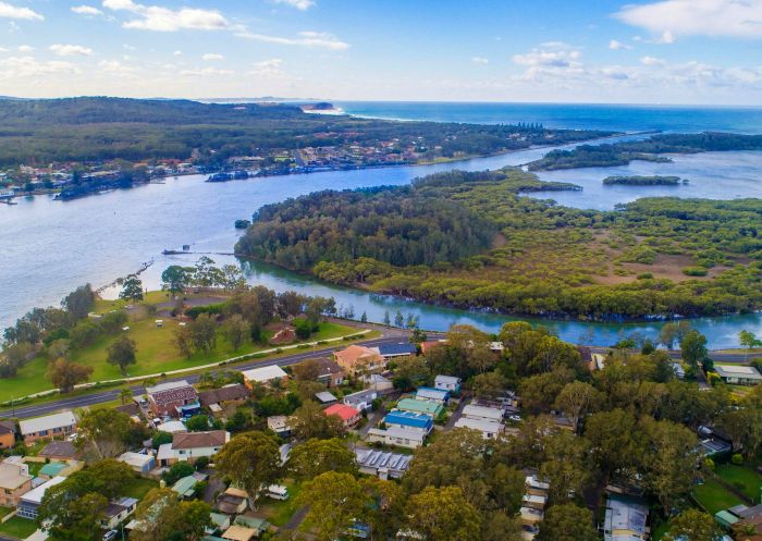 Aerial view of Point Plomer campground in Limeburners Creek National Park, Port Macquarie