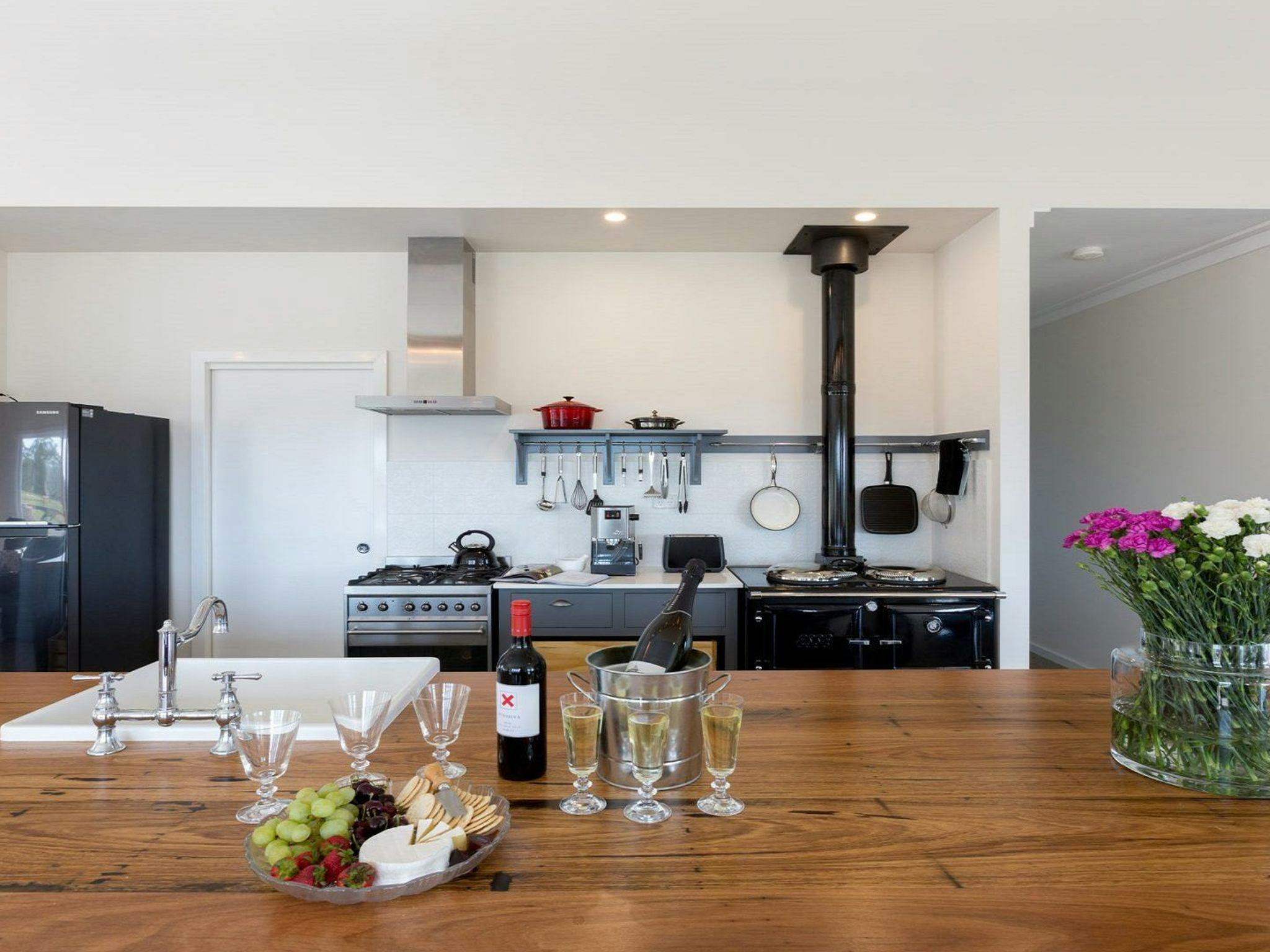 The kitchen cast iron wood-fired boiler and cooker is supplemented by a gas oven and cooktop for use in warmer months.