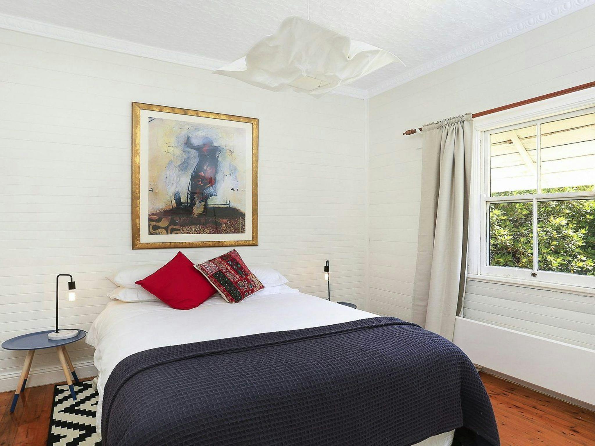 There are three bedrooms at the front of the house sleeping six guests on one queen bed, one double bed and two king singles in a twin room. The style is eclectic and cosy, with an exciting artwork, furniture, and decoration mix.