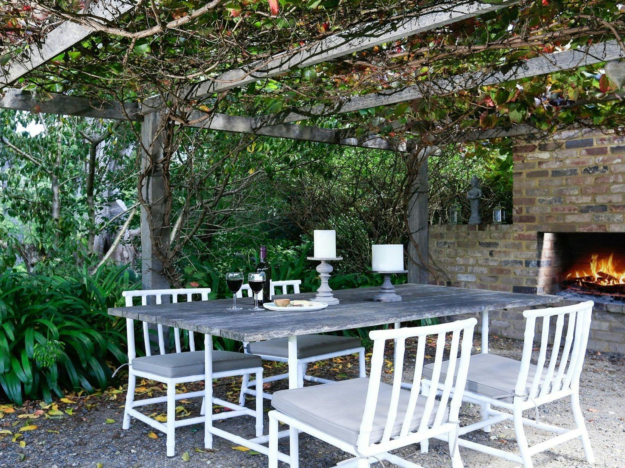 The kitchen has marble benchtops, a Nespresso coffee machine, all mod cons and lots of windows and light. There is a large dining table overlooking the garden and the choice of dining in or outside, with the pergola and open fireplace providing a great outdoor setting.