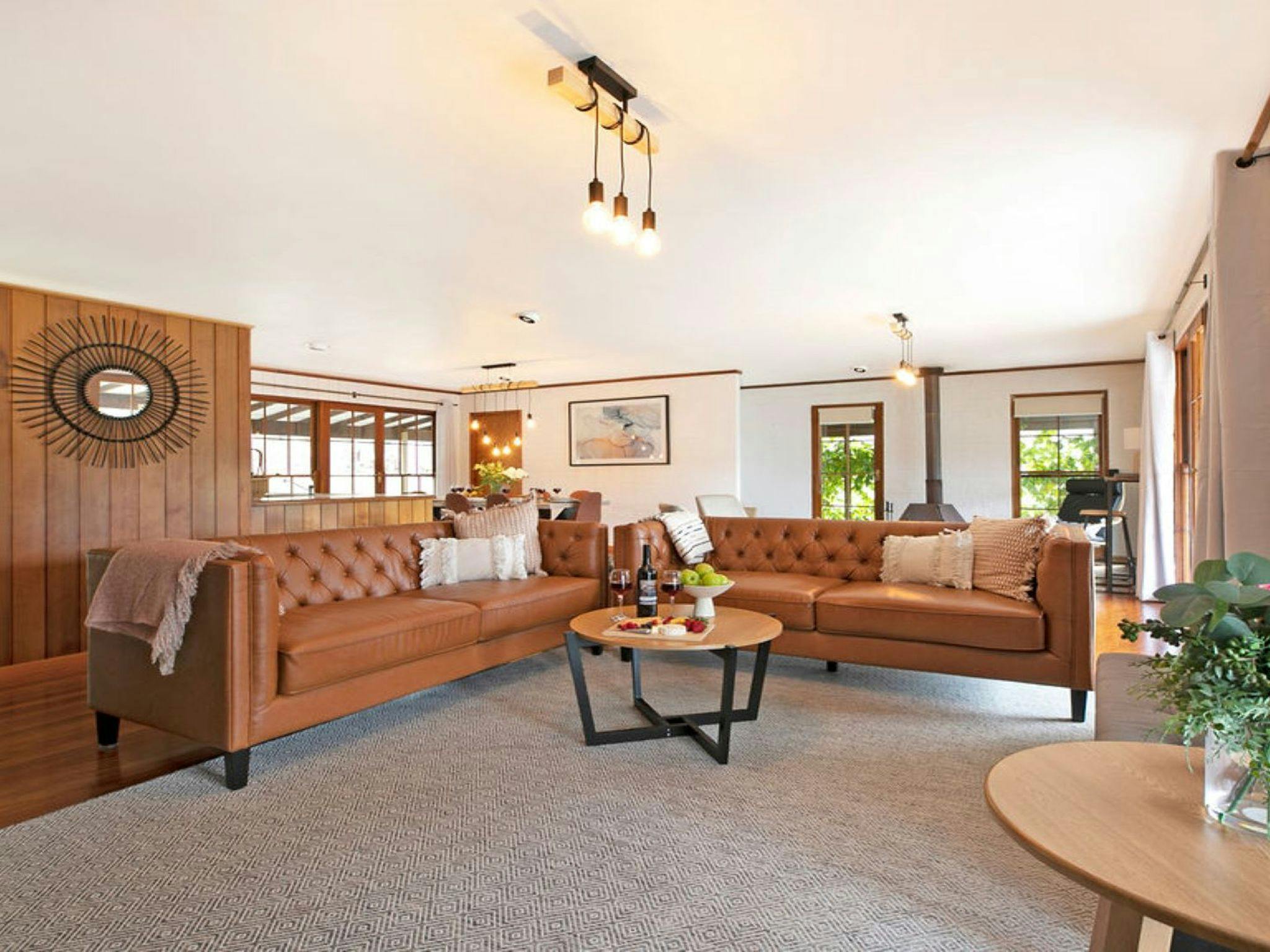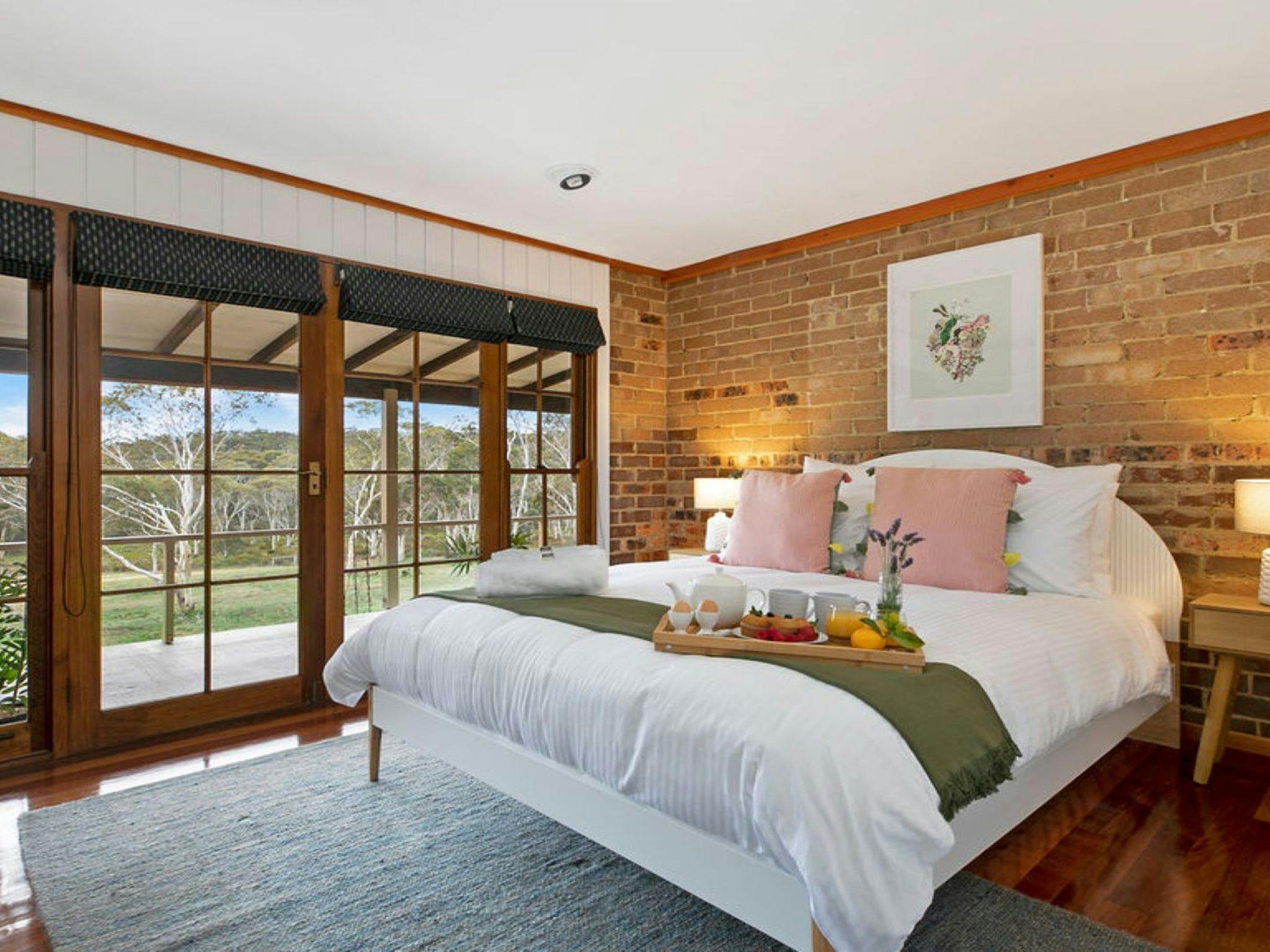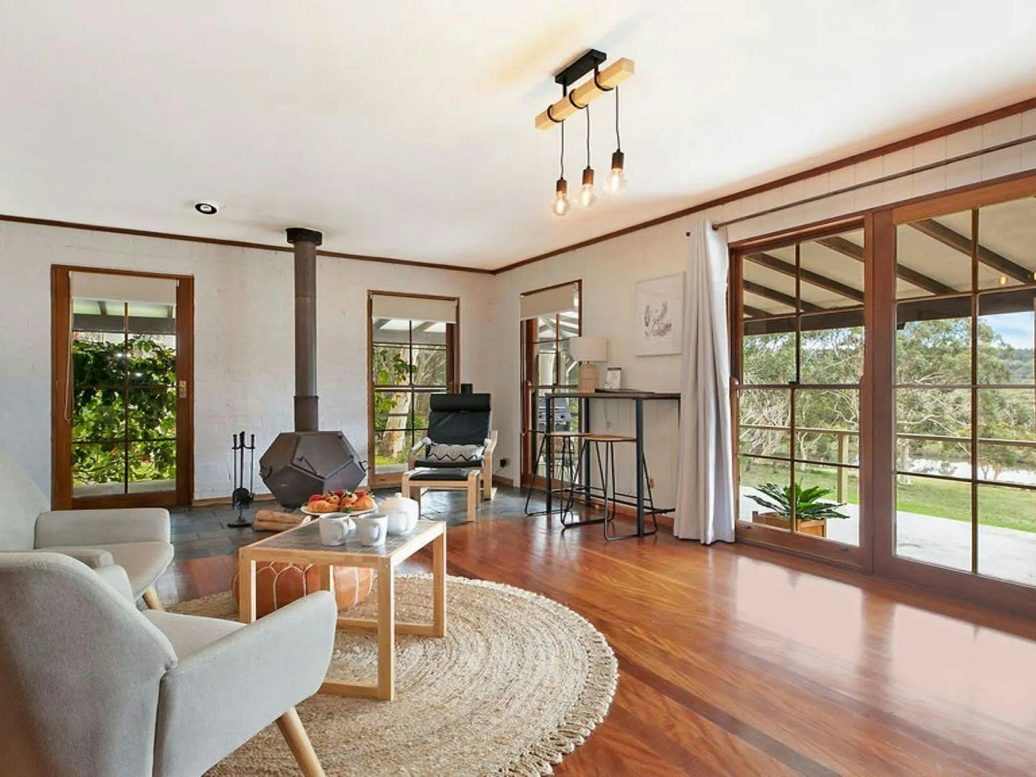 A spacious open-plan living and dining area with large French doors opening onto the veranda brings the outside in. Combining country charm and modern design, it’s hard to escape the beauty of this home. Featuring an exposed brick wall, a wood combustion fireplace and polished floorboards.