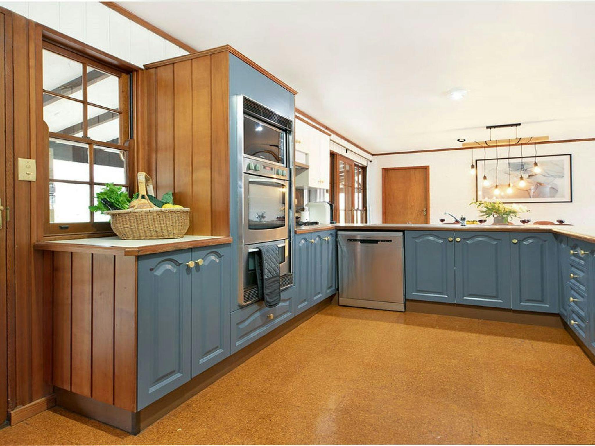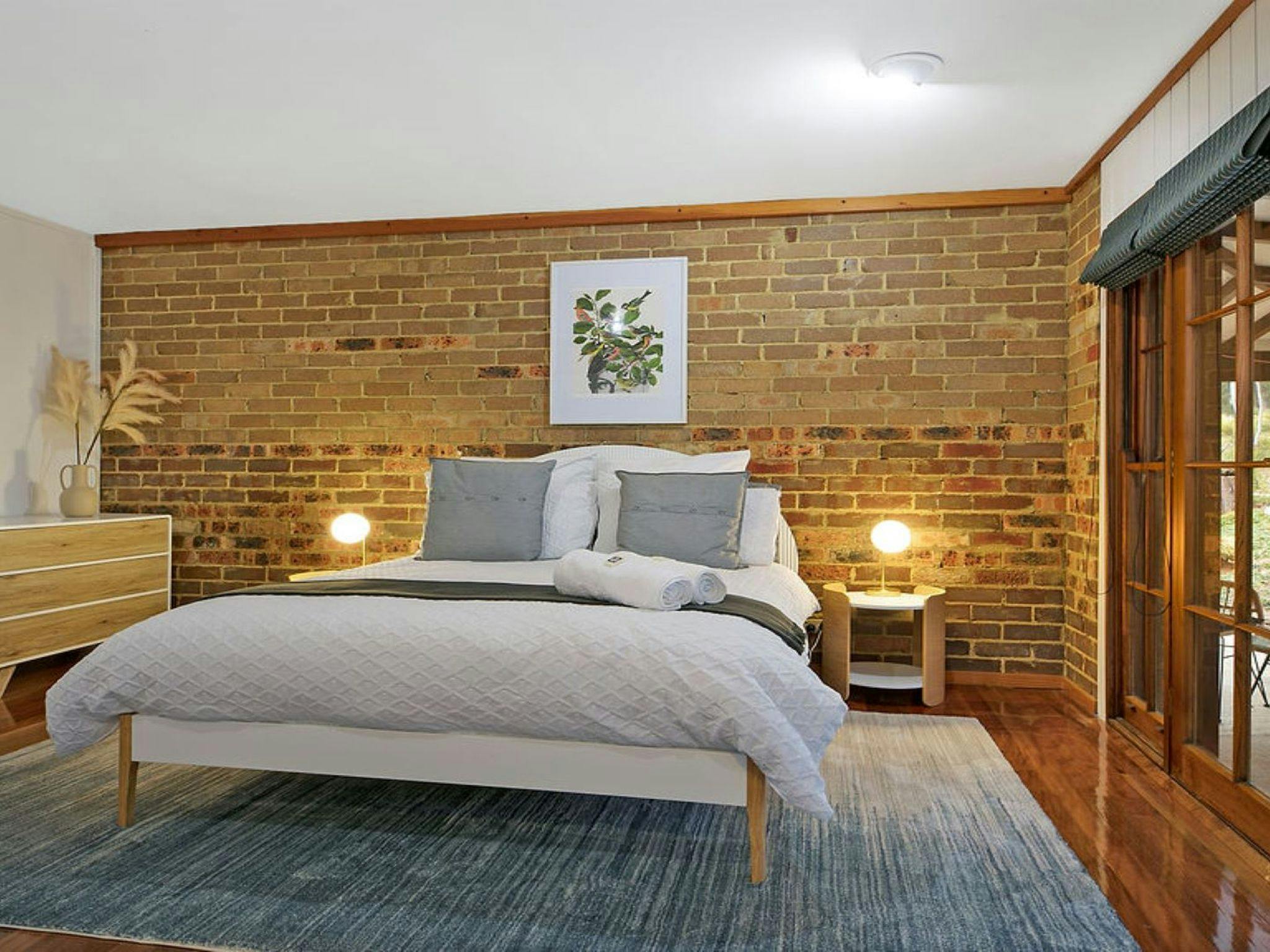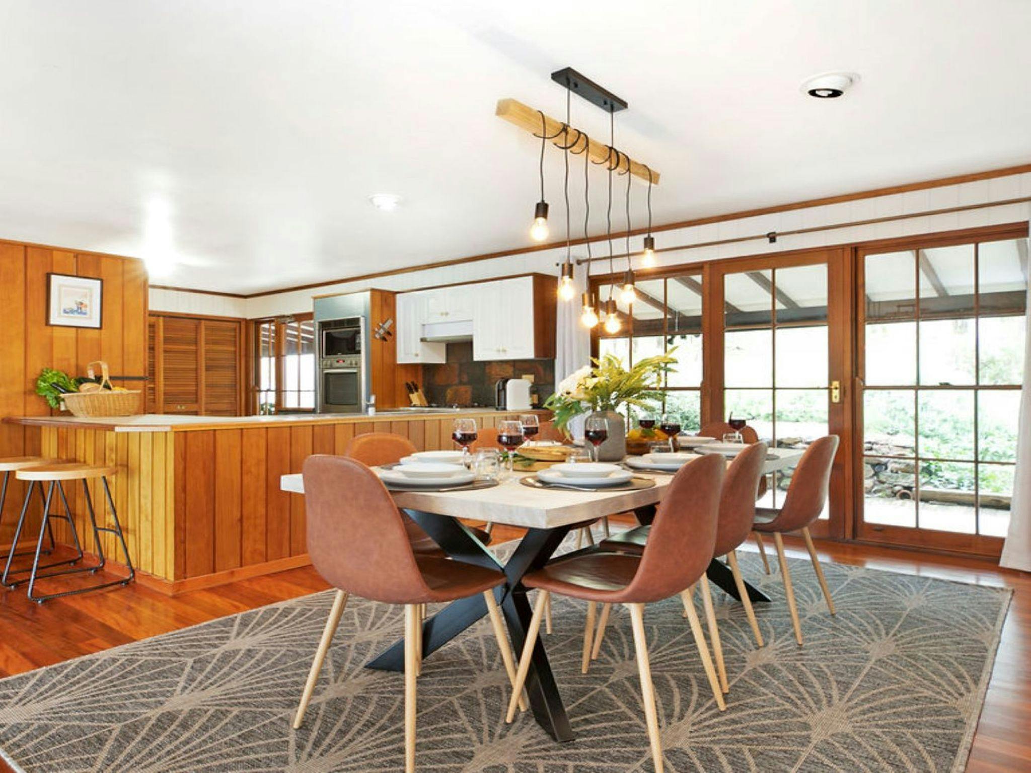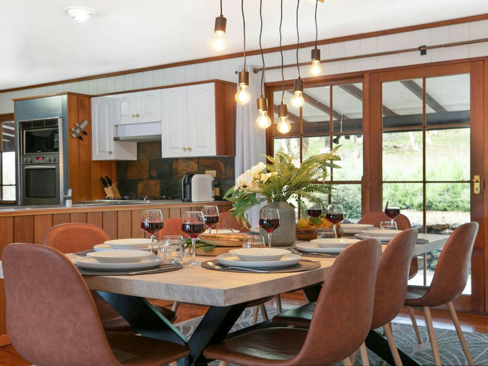 A spacious open-plan living and dining area with large French doors opening onto the veranda brings the outside in. Combining country charm and modern design, it’s hard to escape the beauty of this home. Featuring an exposed brick wall, a wood combustion fireplace and polished floorboards.