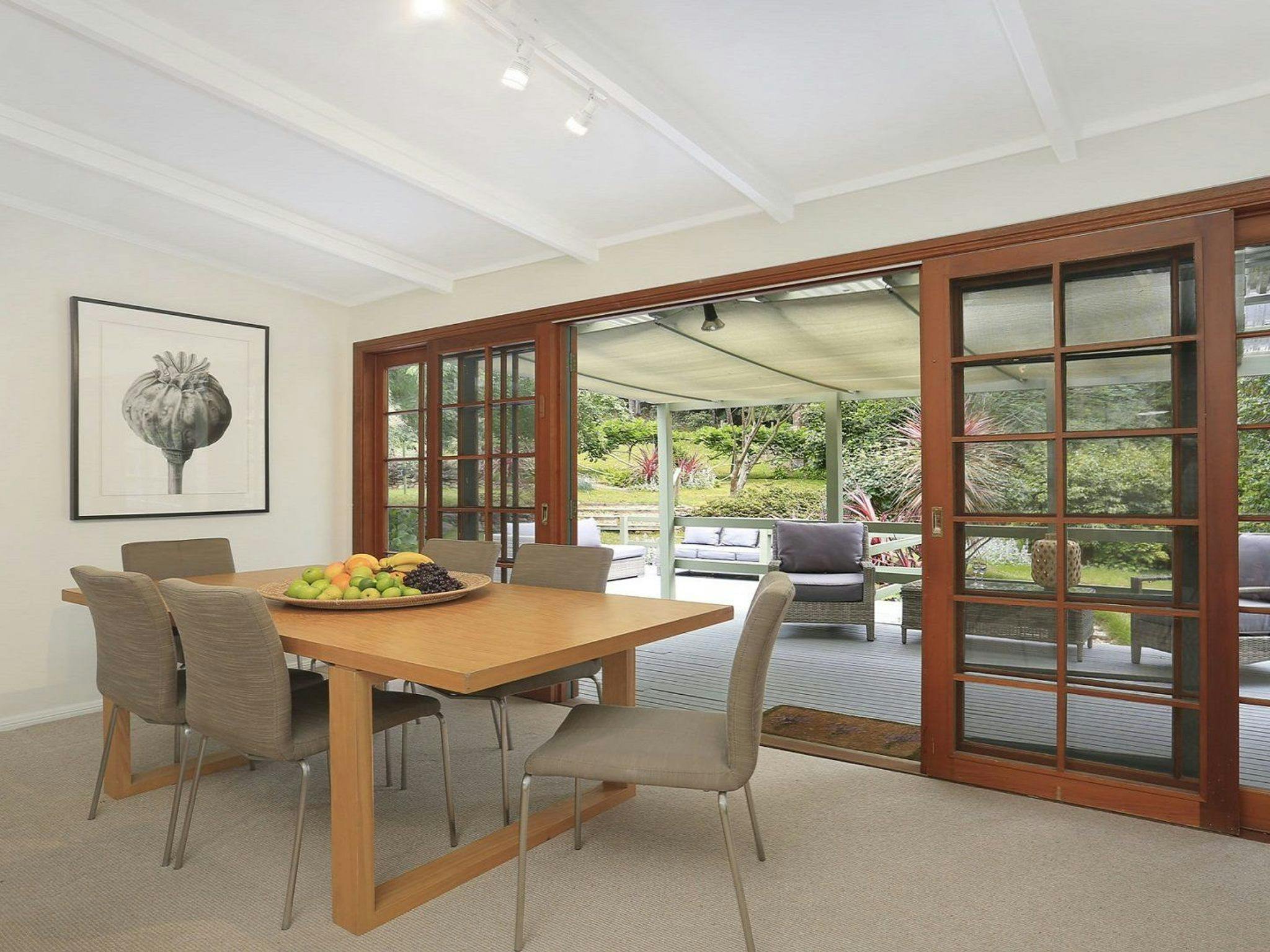 The dining room opens to a covered north-facing rear deck, a great place to entertain in the warmer months with barbeque and outdoor furniture.