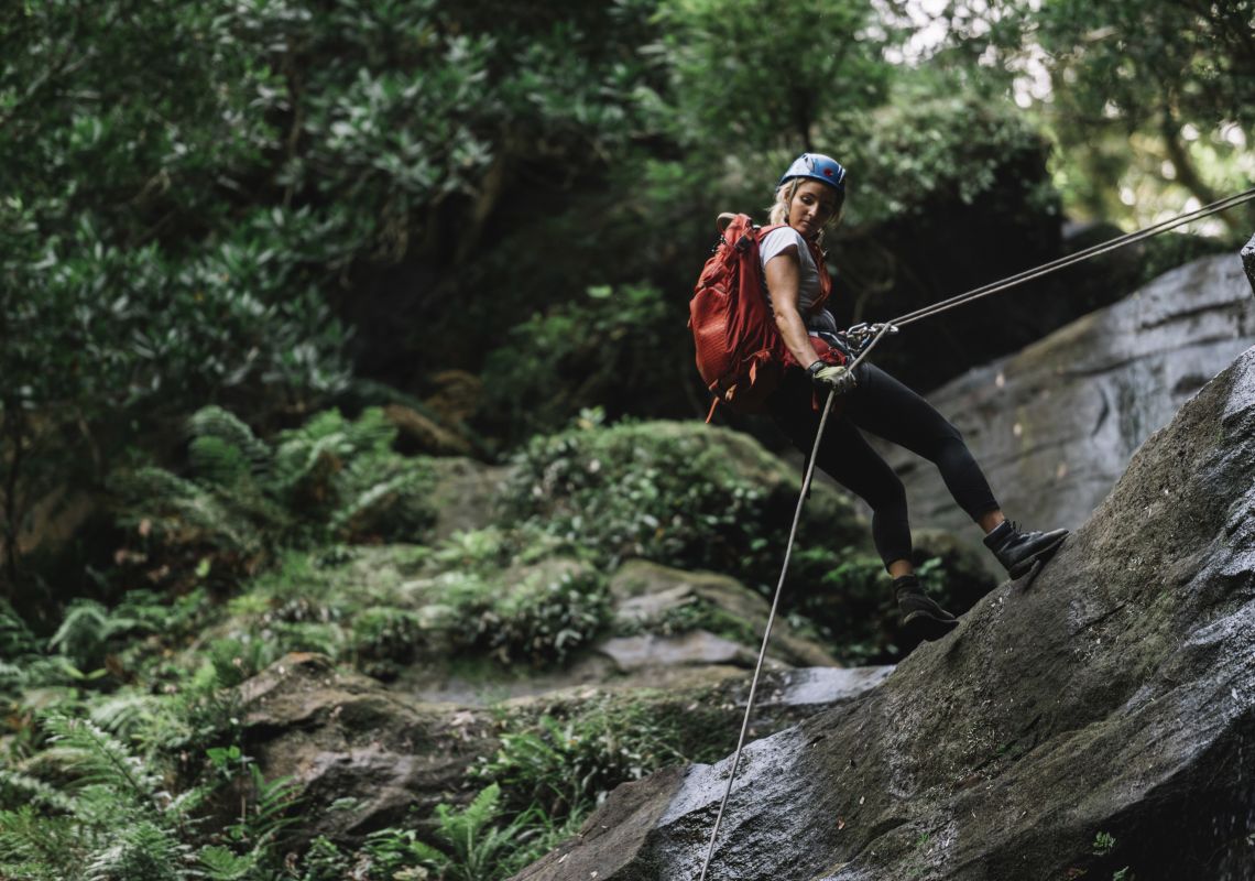 Woman abseiling Gap Creek Falls in Watagans National Park, Lake Macquarie