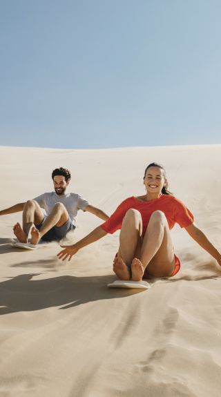 Couple enjoying a Sand Dune Adventure tour with an Aboriginal Guide in Port Stephens, Destination NSW