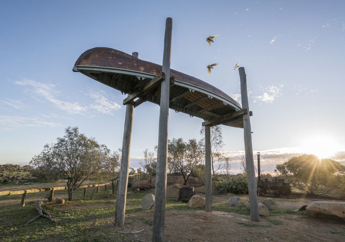 Tibooburra’s Pioneer Park is the site of a remarkable sculpture, Myth and Mirage 1999. The upside-down whaleboat is an exact replica of the boat Captain Charles Sturt dragged from Adelaide, in order to cross the inland sea he was convinced he would discover in the centre of Australia