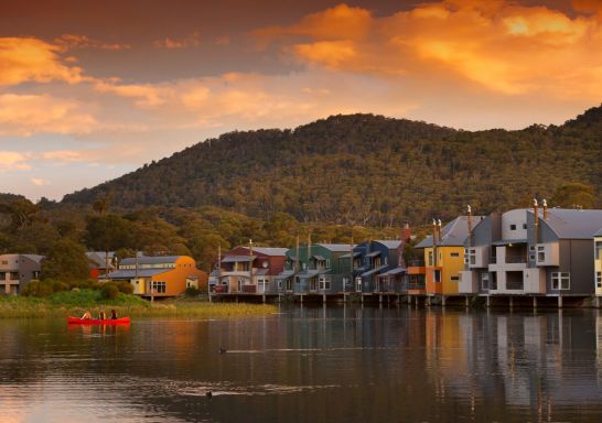 Jindabyne has a huge range of accommodation, including holiday parks, pet-friendly alpine lodges, hotels, apartments and B&Bs. Luxurious cottages are dotted throughout the lush bushland, like Mill Cabin, Common Kosci and Crafters Cabins. There’s a stunning glamping option at Freaks of Nature Retreat or get a slice of country life at Avonside Alpine Estate, a postcard-perfect working farm.