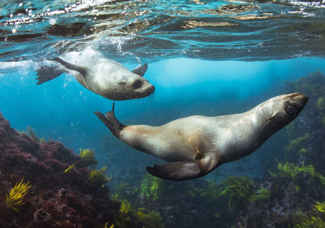 Fur seals swimming around Montague Island in Narooma, Batemans Bay Area, South Coast