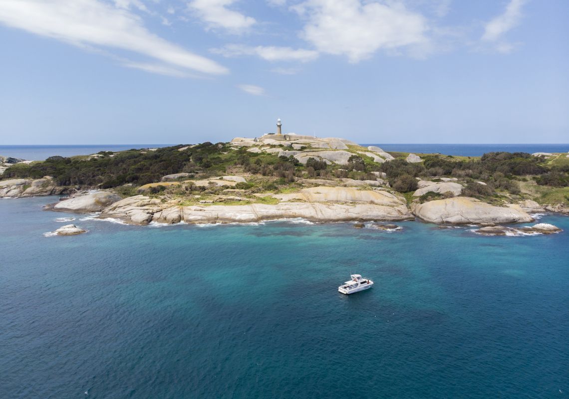 Montague Island Adventures tour boat along the shores of Montague Island Nature Reserve, Narooma.