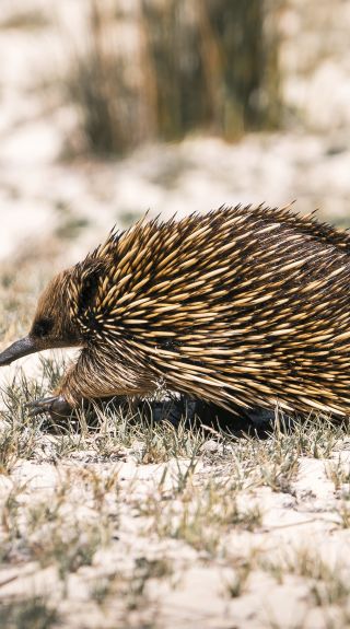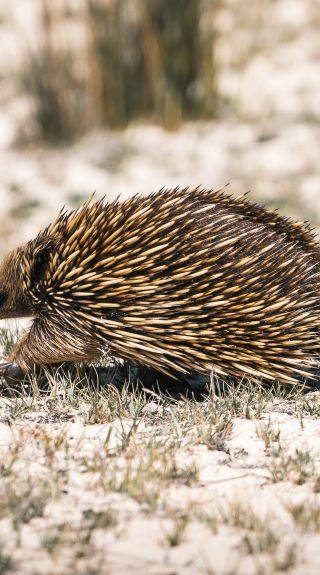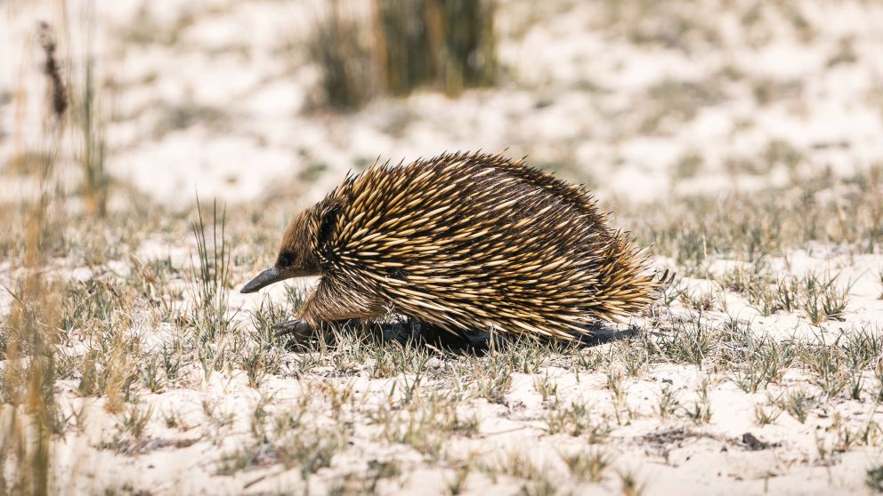 Echidna walking across sand along the Bingi Dreaming Track, Meringo, Batemans Bay & Eurobodalla Area