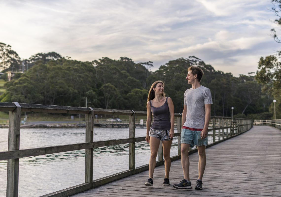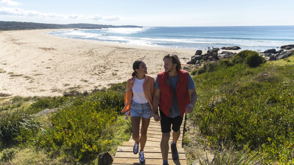 Couple enjoying scenic coastal views along the Bingi Dreaming Track in Eurobodalla National Park, South Coast