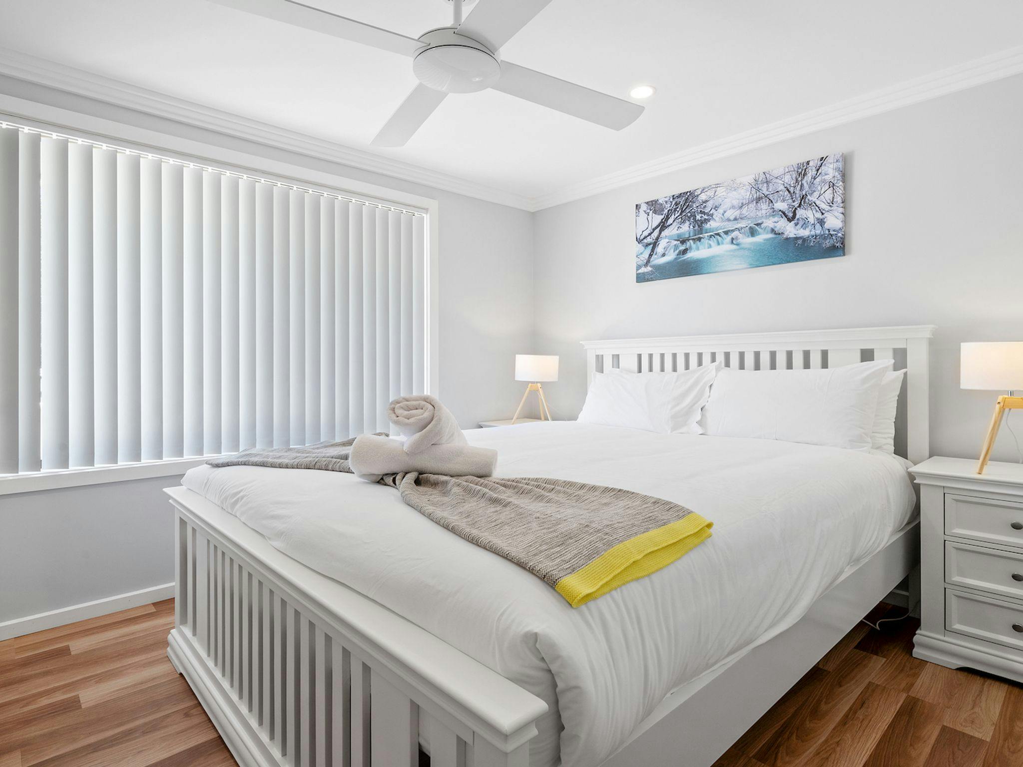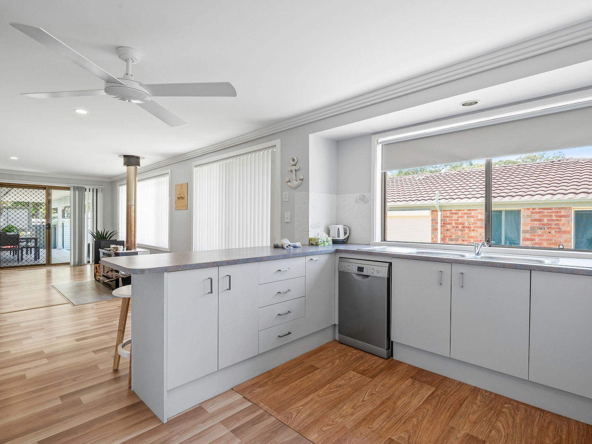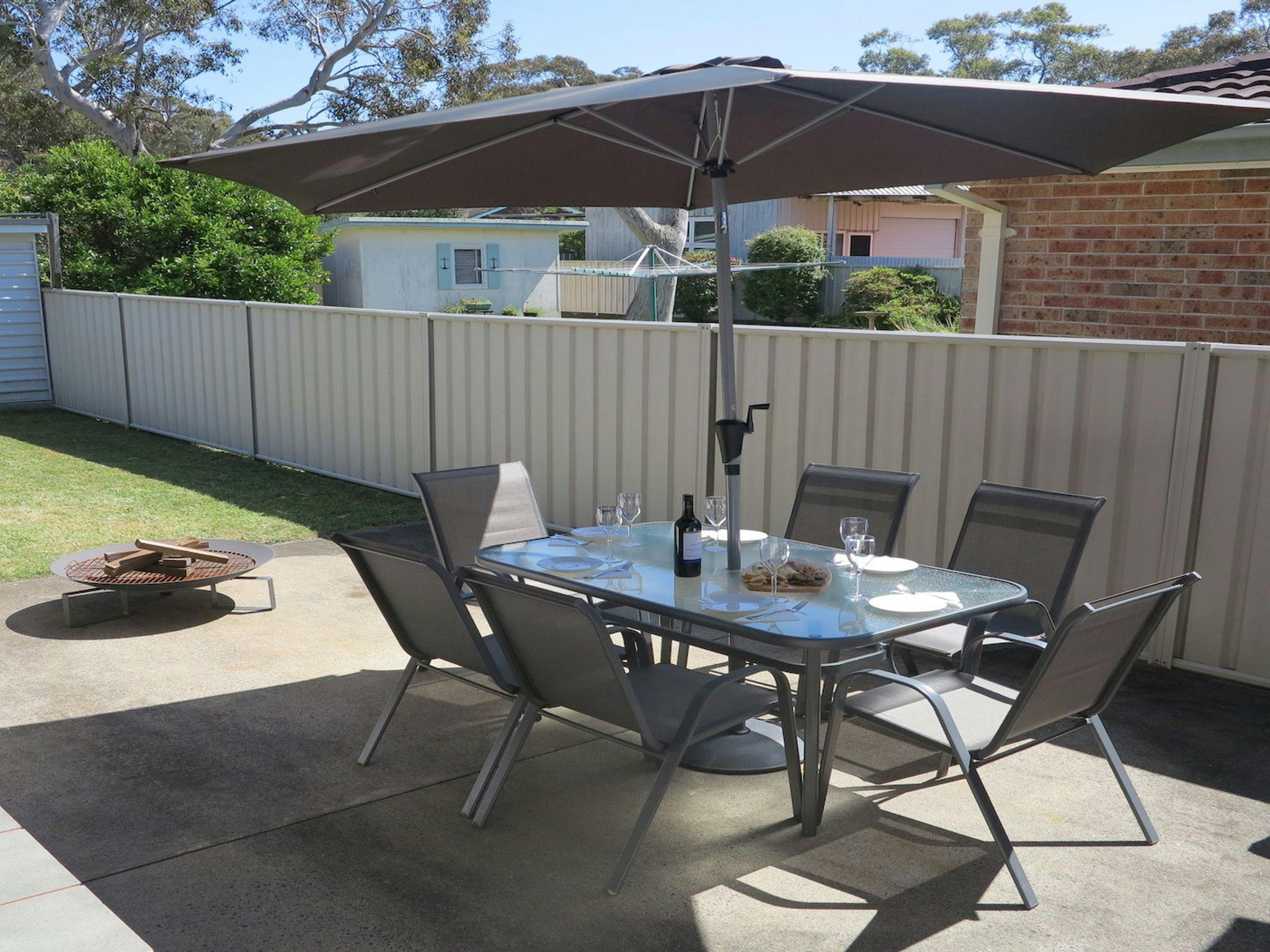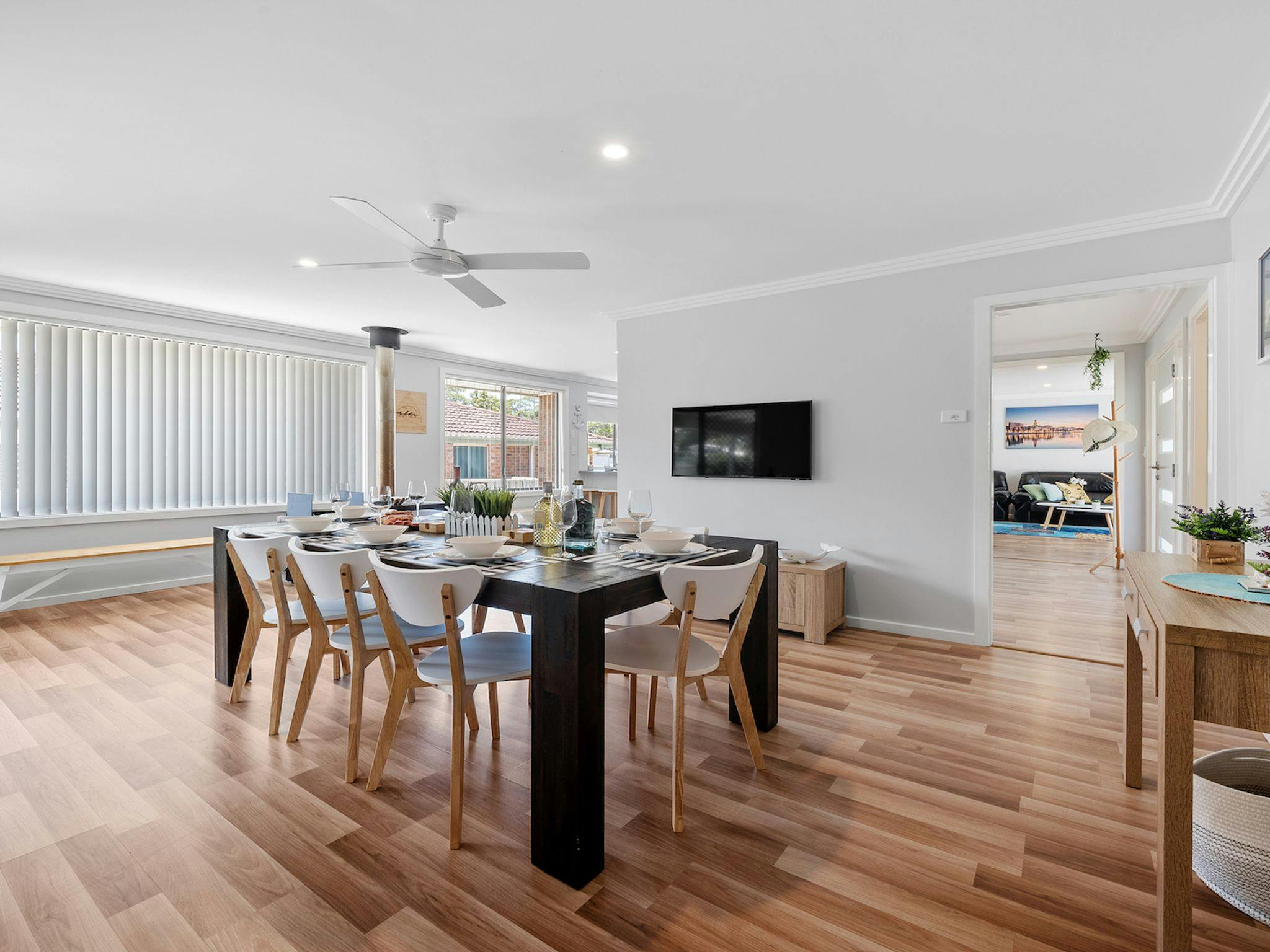 Just 300m from the white sands of Callala Beach Relaxed beach cottage with spacious rear deck and BBQ Open-plan living with modern kitchen and Smart TVs