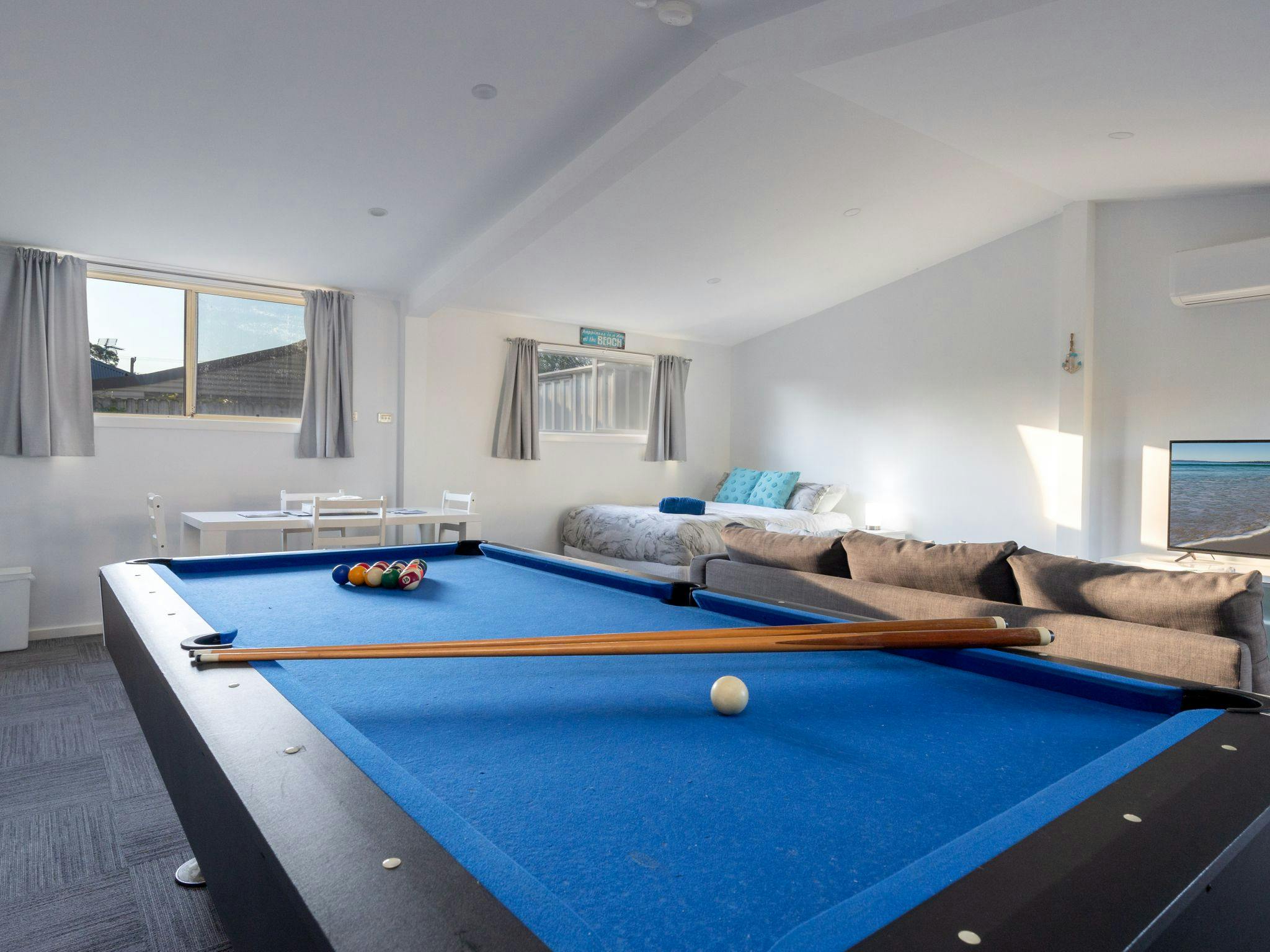The property features plenty of spacious living rooms for everyone to relax, watch a movie, or enjoy a good book. The cabin at the rear of the property has a queen bed and sofa bed if the parents or teenagers are looking for that separate area. It also has a smart television and a pool table for a friendly game.
