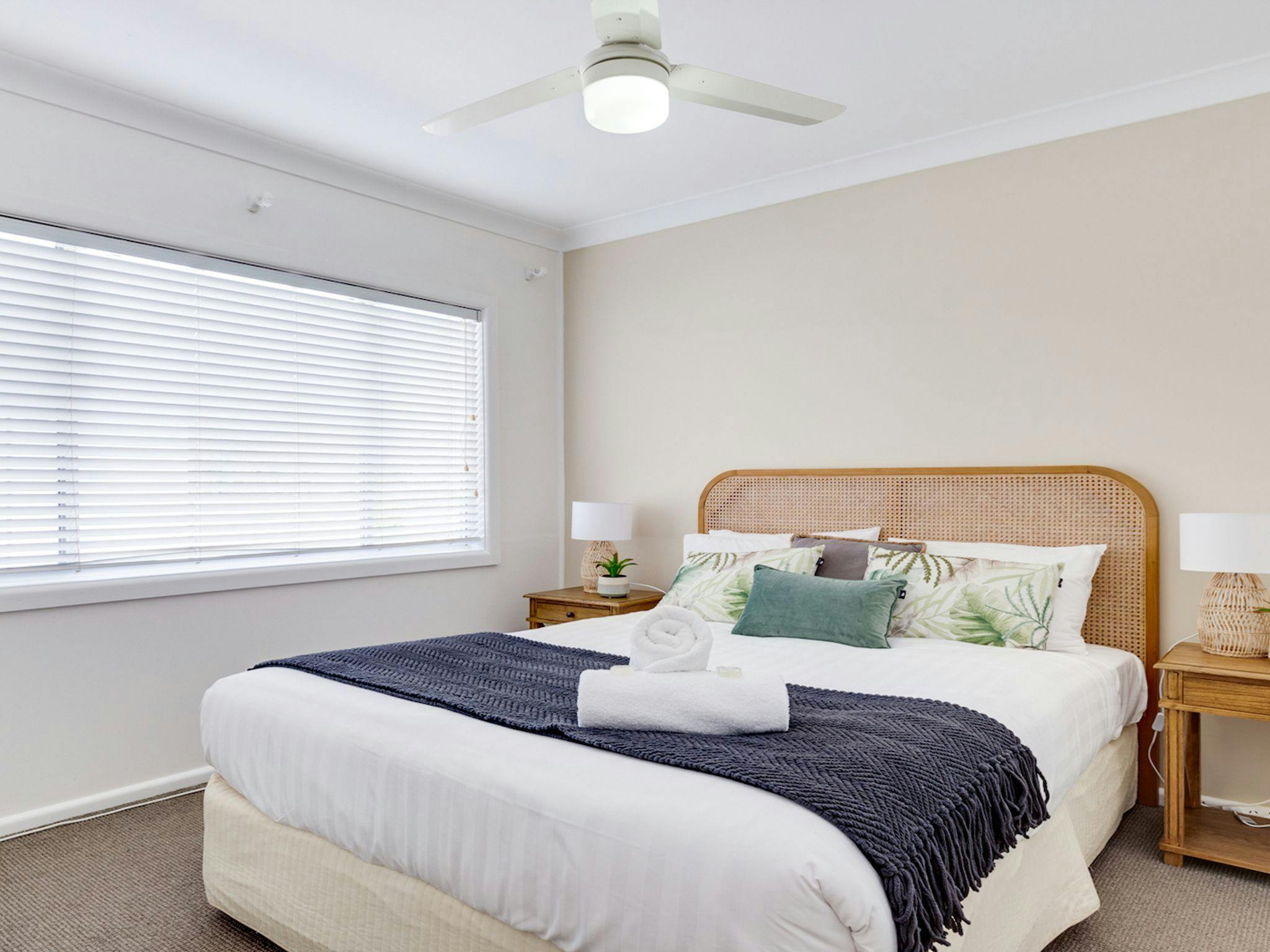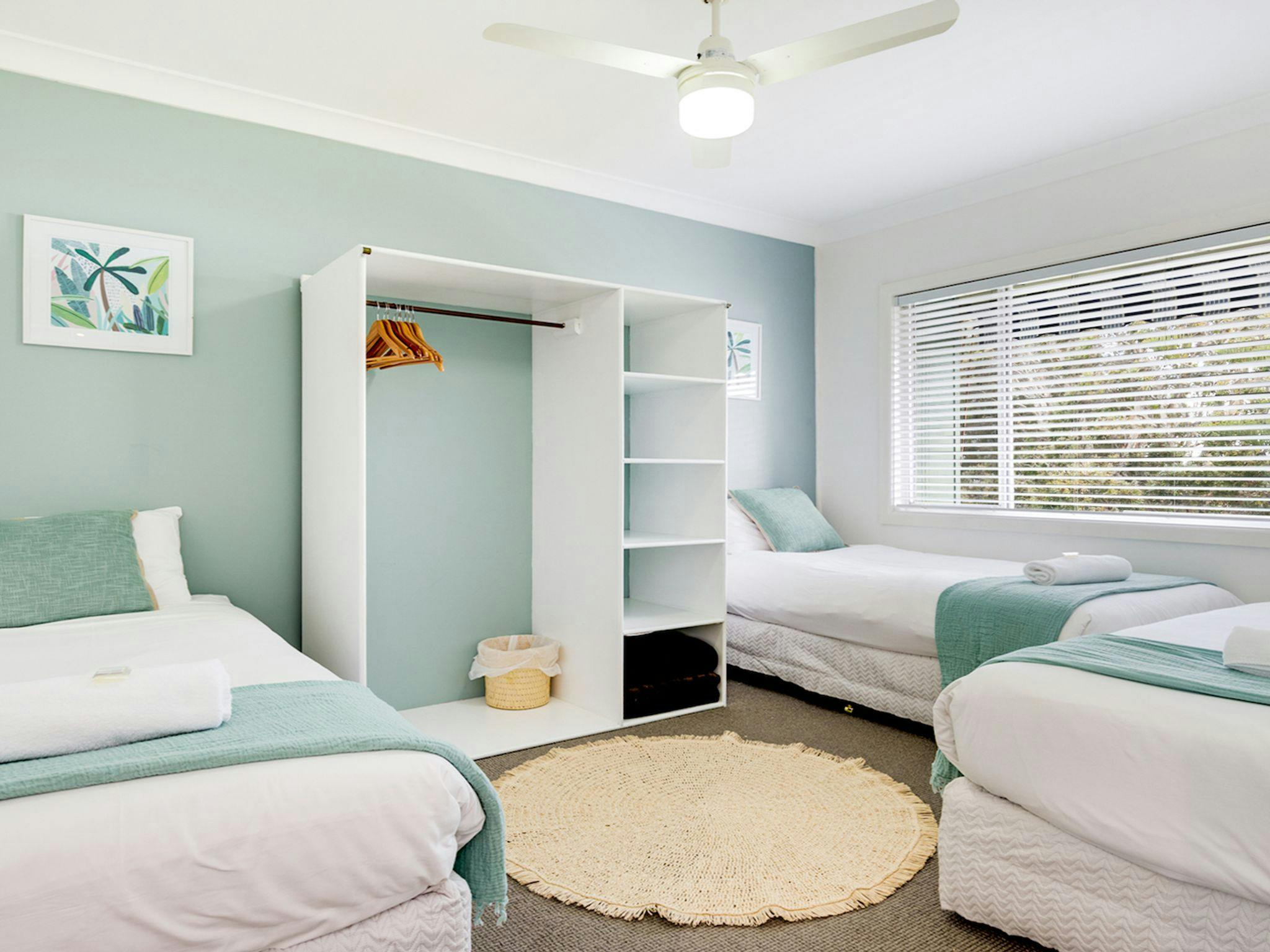 The apartment has two bedrooms with a queen size bed in the main and three single beds in the second bedroom.