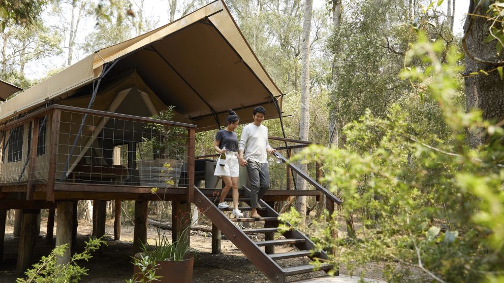 Couple enjoying a romantic glamping getaway at Paperbark Camp, Woollamia, Jervis Bay and Shoalhaven