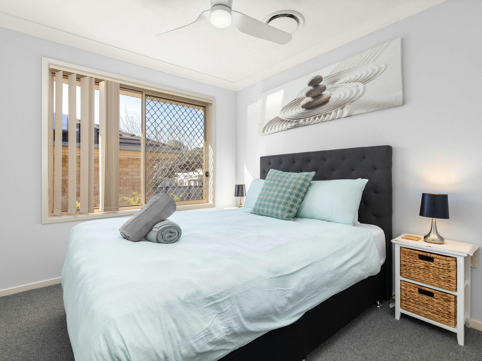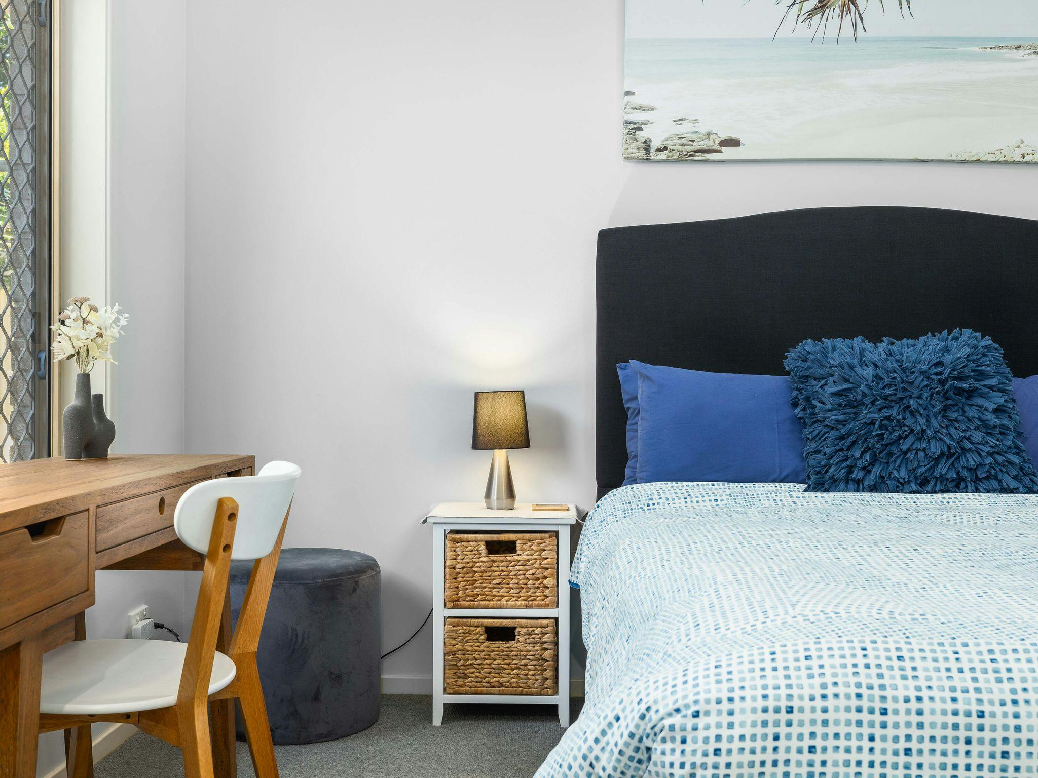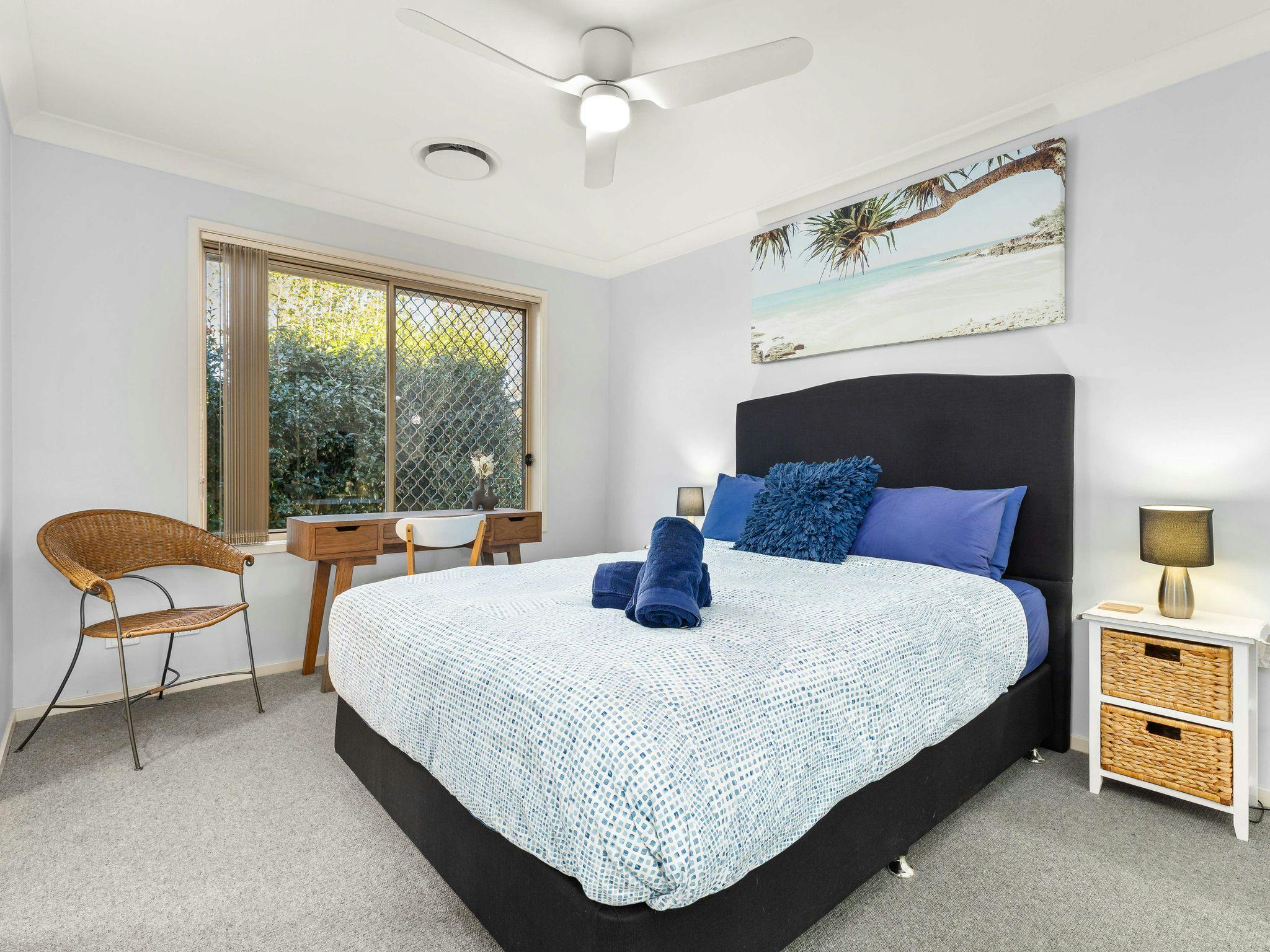 This property comfortably sleeps six people across three bedrooms, each featuring a queen bed, ducted air conditioning, a ceiling fan, and a built-in wardrobe. The master bedroom also includes a work station and ensuite access.