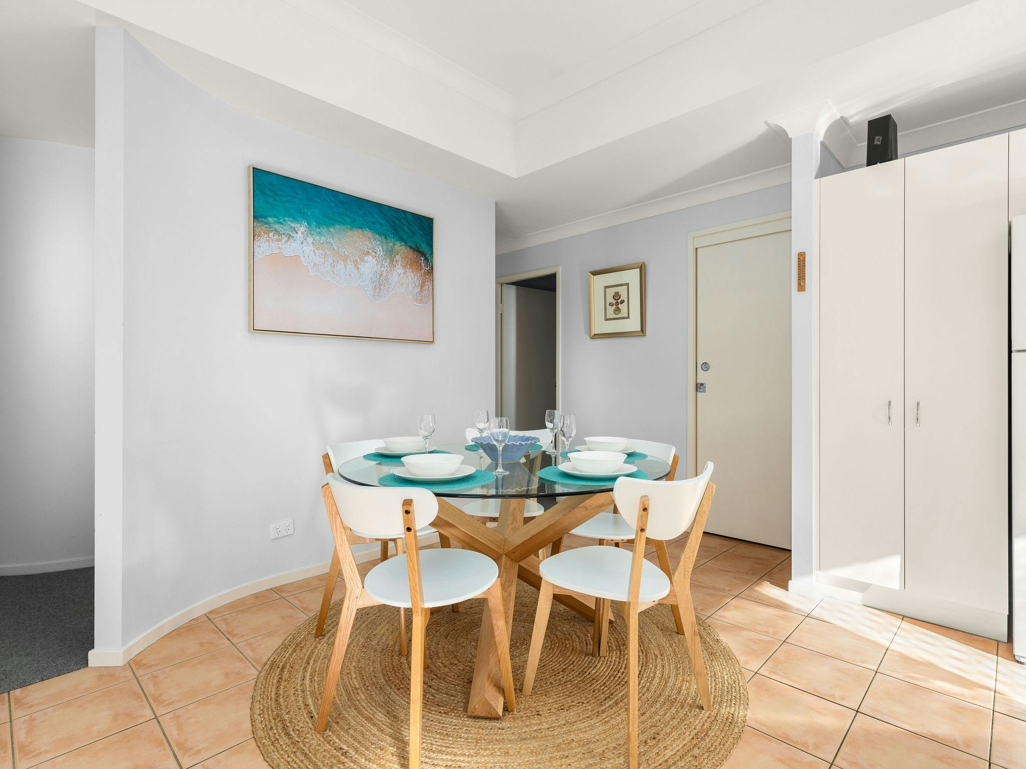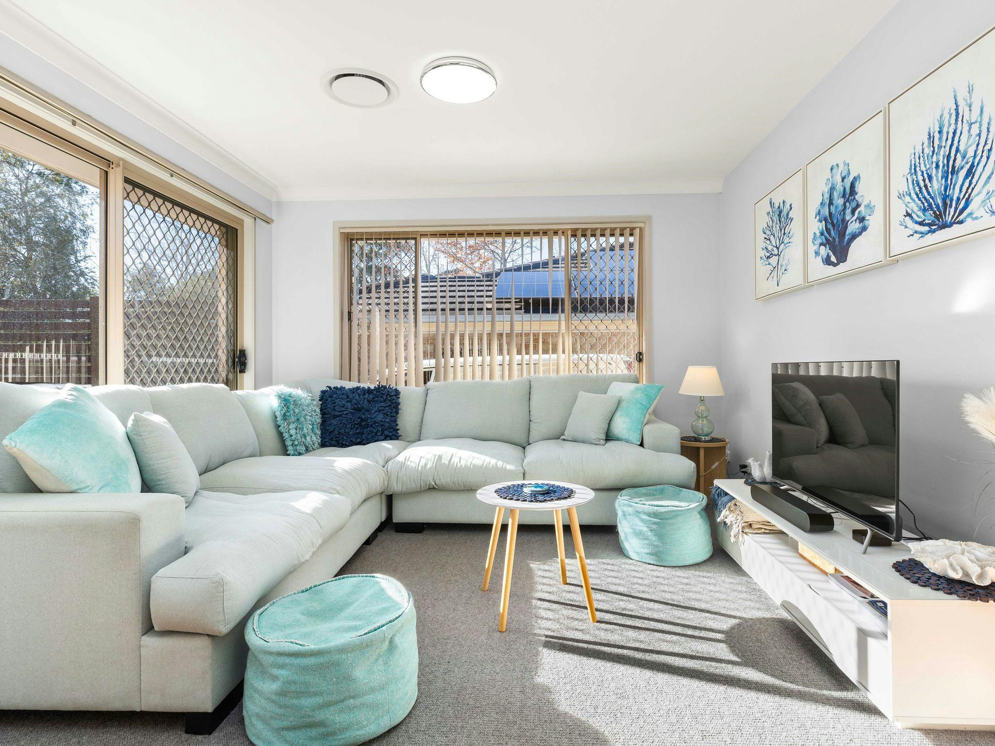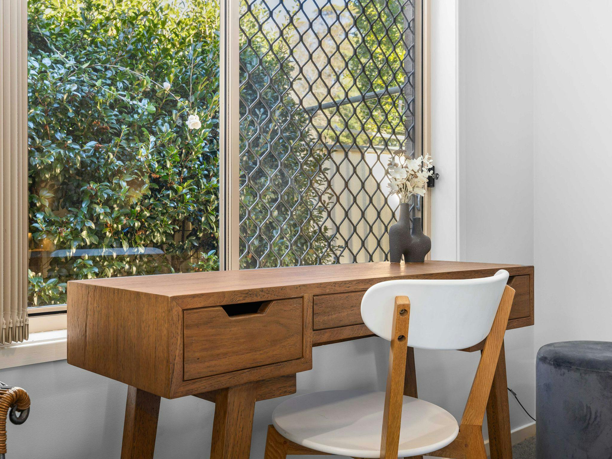 This property comfortably sleeps six people across three bedrooms, each featuring a queen bed, ducted air conditioning, a ceiling fan, and a built-in wardrobe. The master bedroom also includes a work station and ensuite access.