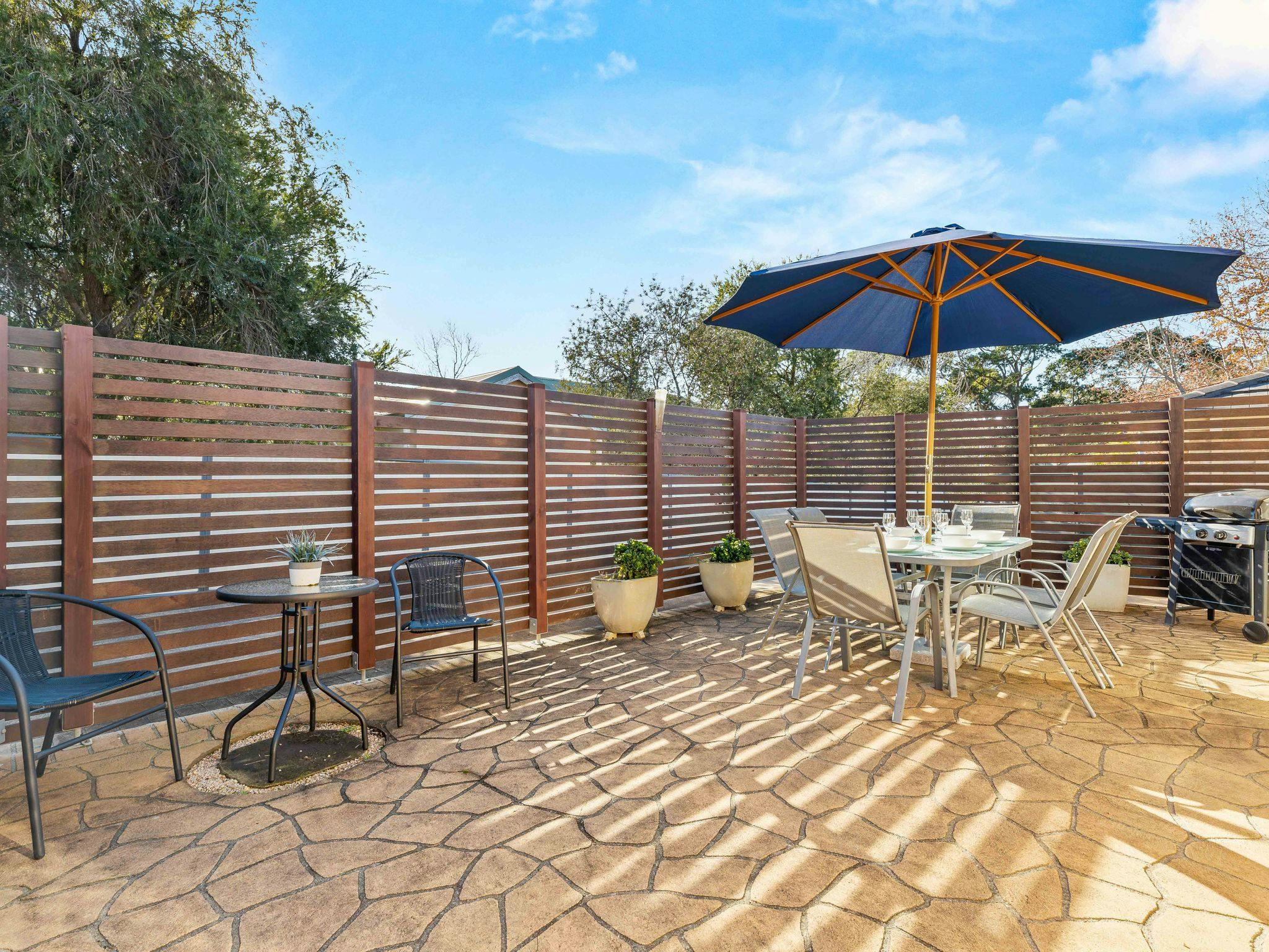 The open-plan lounge and dining area seats six and includes a smart television and board games. Outdoor amenities feature a dining area for six, a barbecue, and a secure yard.
