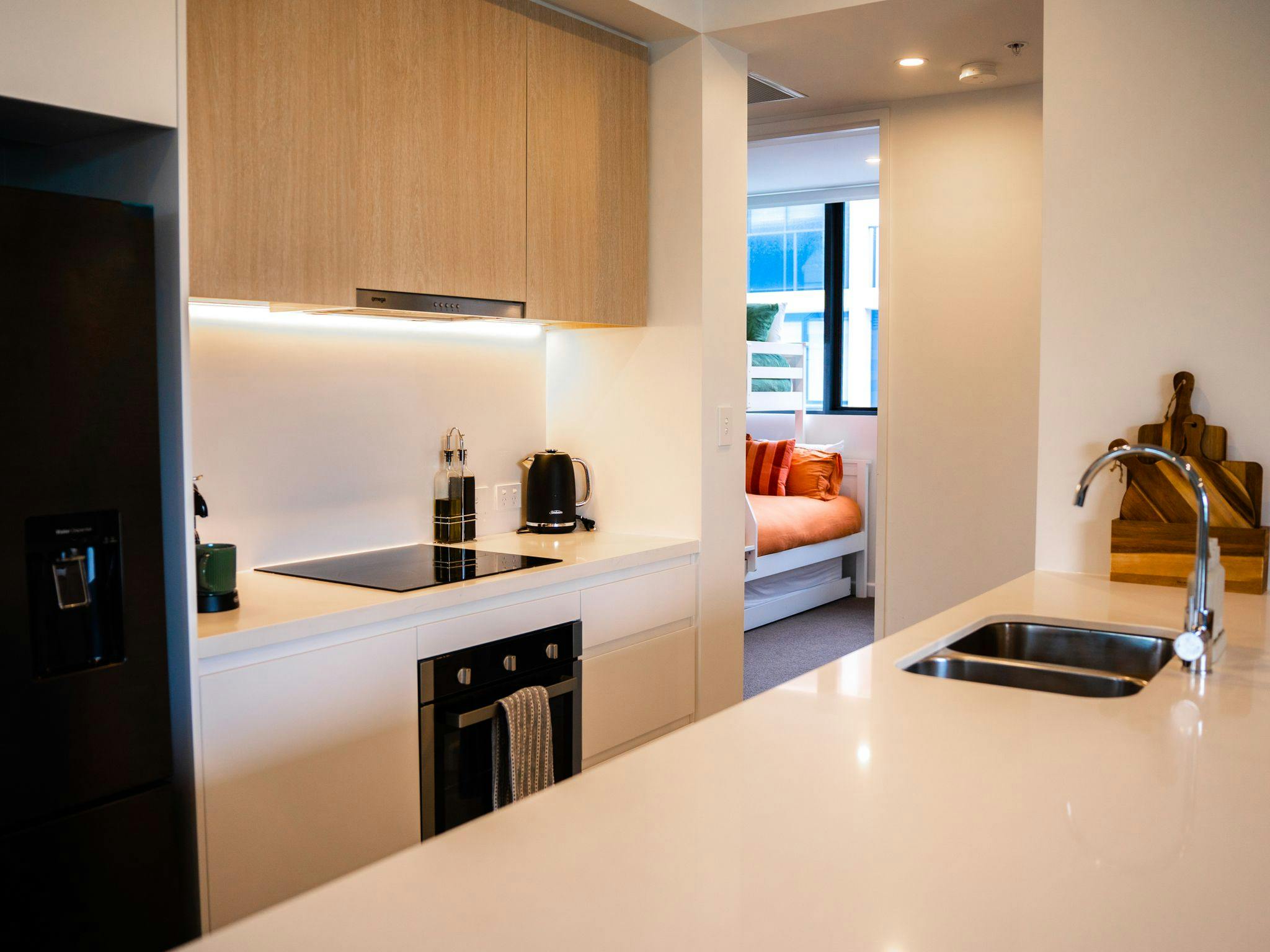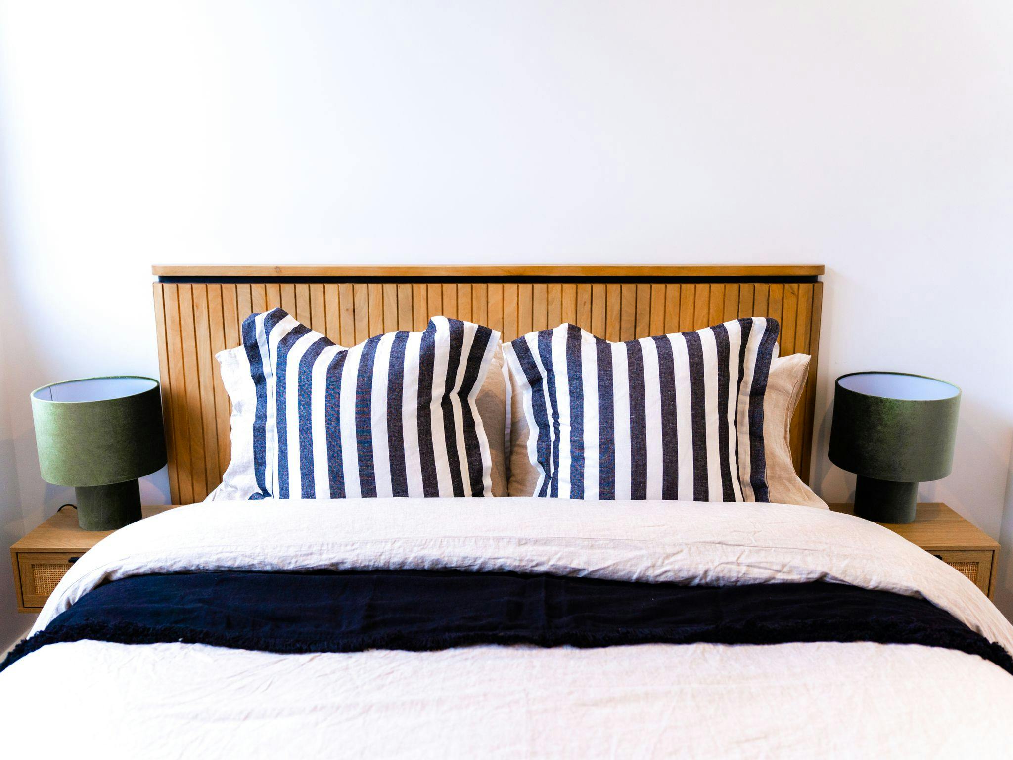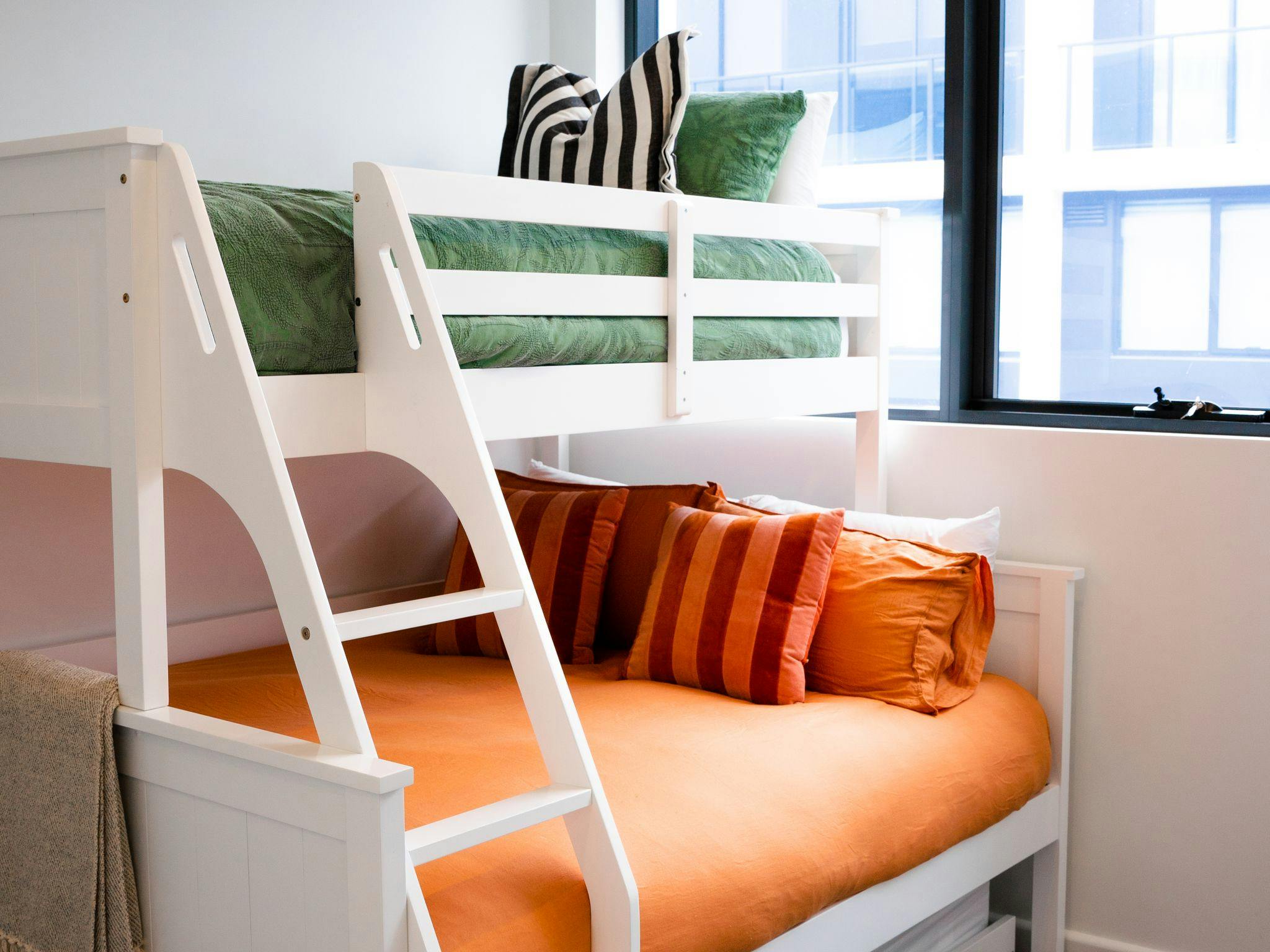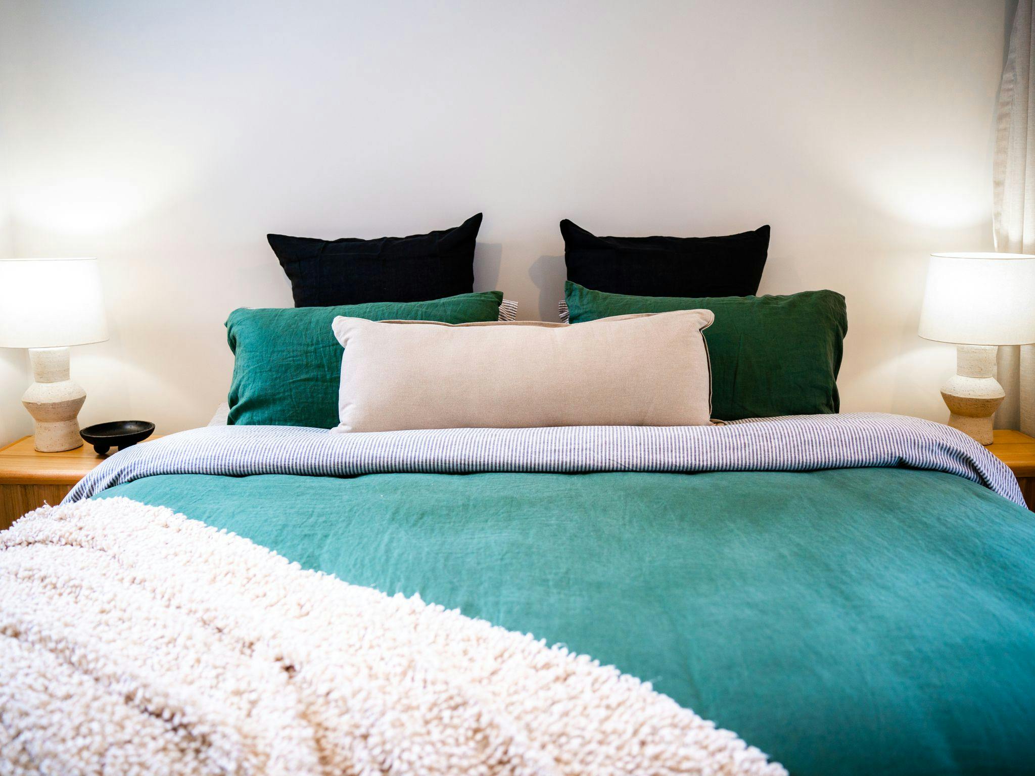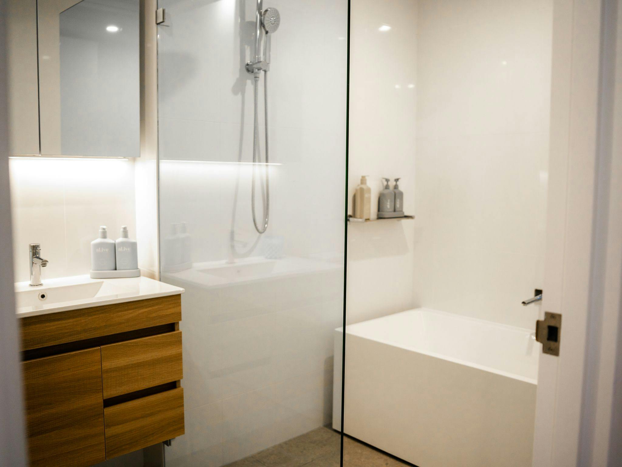 The property features three bedrooms, including a King room, a Queen room, and a Tri-Bunk room, all with ducted air-conditioning and built-in wardrobes. Guests have access to two bathrooms: an ensuite with a bath and a main bathroom with a shower. High-quality amenities such as shampoo, conditioner, and body wash are provided.