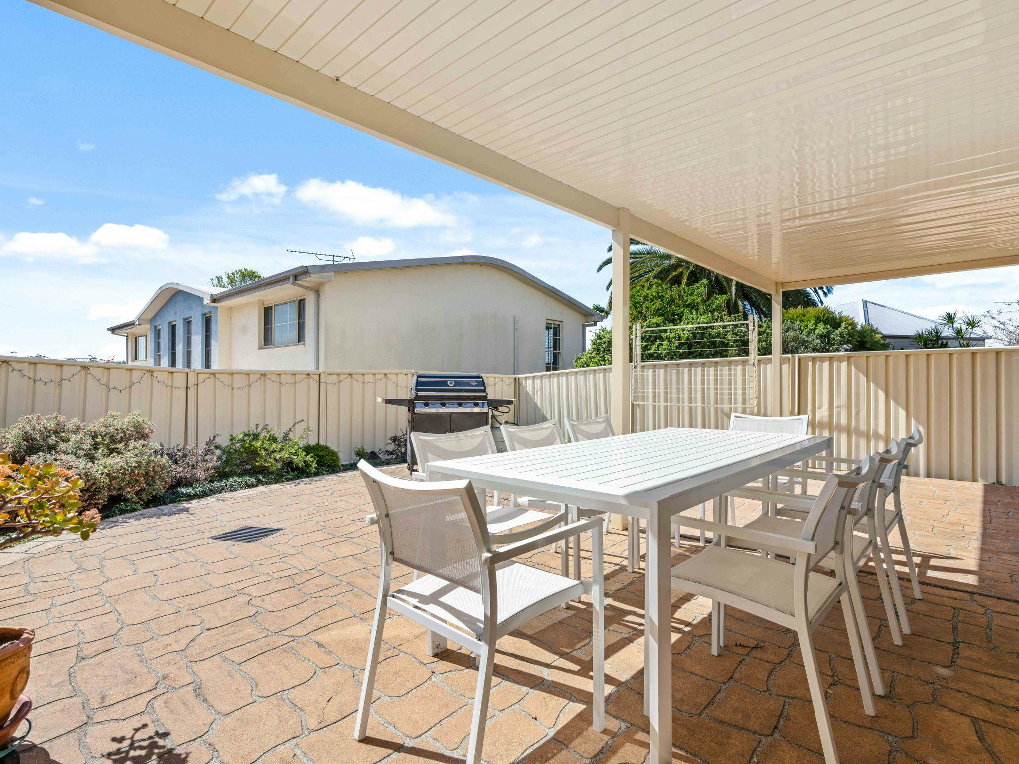 Relax in the comfortable living spaces, including two lounges equipped with TVs and board games, or enjoy meals in the well-appointed dining area. The kitchen features modern appliances, including a pod coffee machine, dishwasher, and electric cooking facilities, ensuring a hassle-free stay. Outdoors, a covered entertaining area with a barbeque and seating for eight provides the perfect space to enjoy the fresh coastal air.