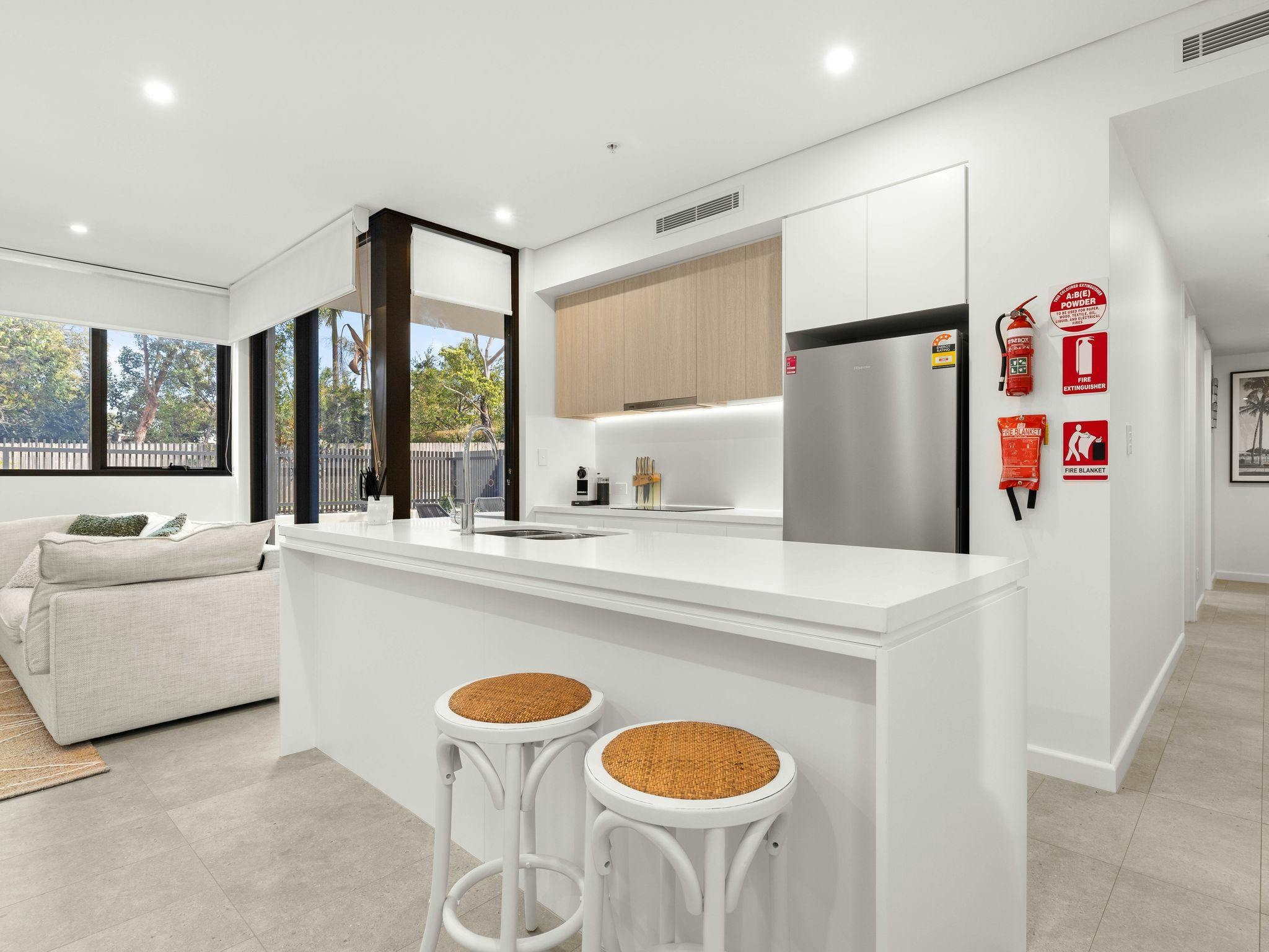 The kitchen is well-equipped with an electric cooktop, oven, dishwasher, microwave, and pod coffee machine. The living area offers seating for five and a Smart television.