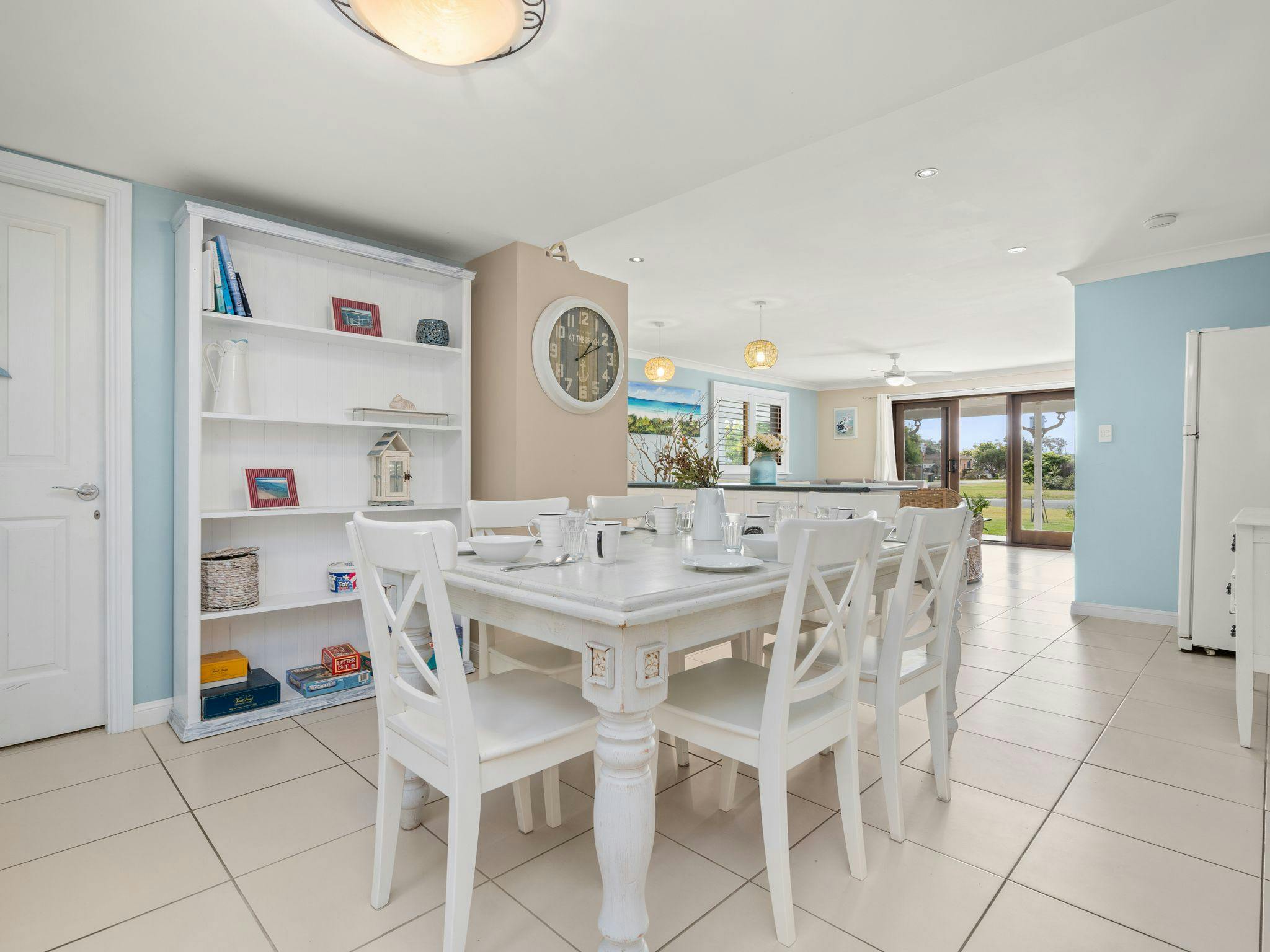 Outdoor living is well-catered with three different dining areas: a front garden table for enjoying the sea breeze, a rear table seating eight with a large gas barbecue, and an outdoor shower.