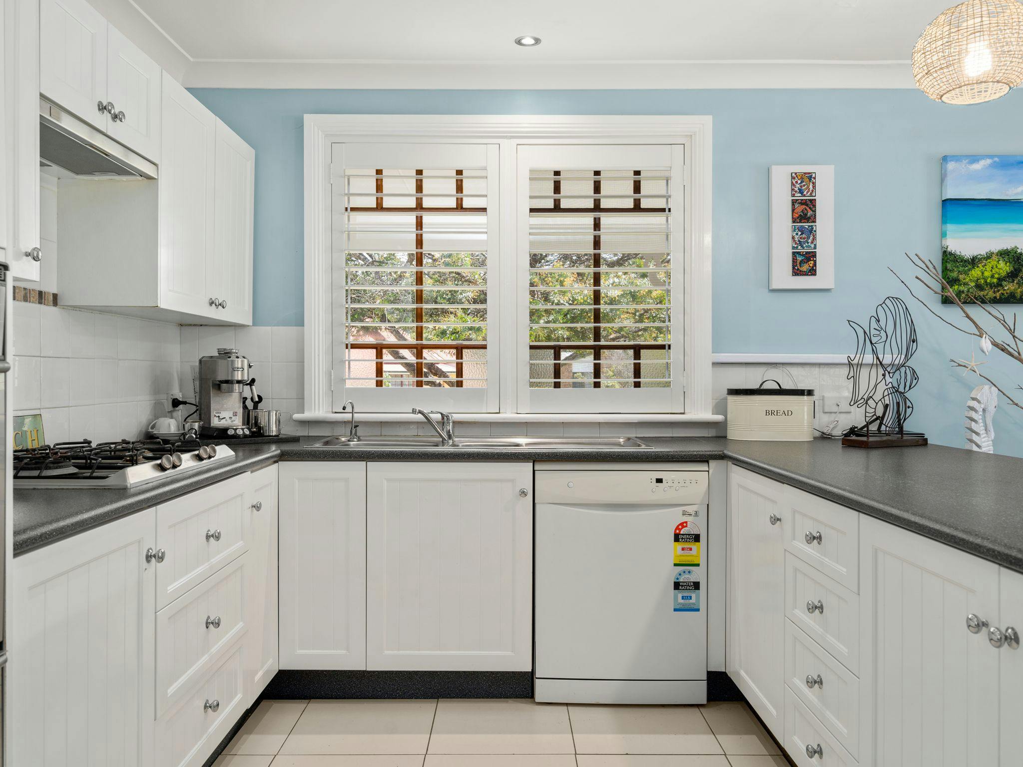 The kitchen is well-stocked with a fridge, oven, gas cooktop, dishwasher, Delonghi espresso machine, microwave, and a breakfast bar for four. The bathroom offers a spa bath, a shower, a basin, and toilet. A washer, sink, and ironing facilities are available in the laundry.