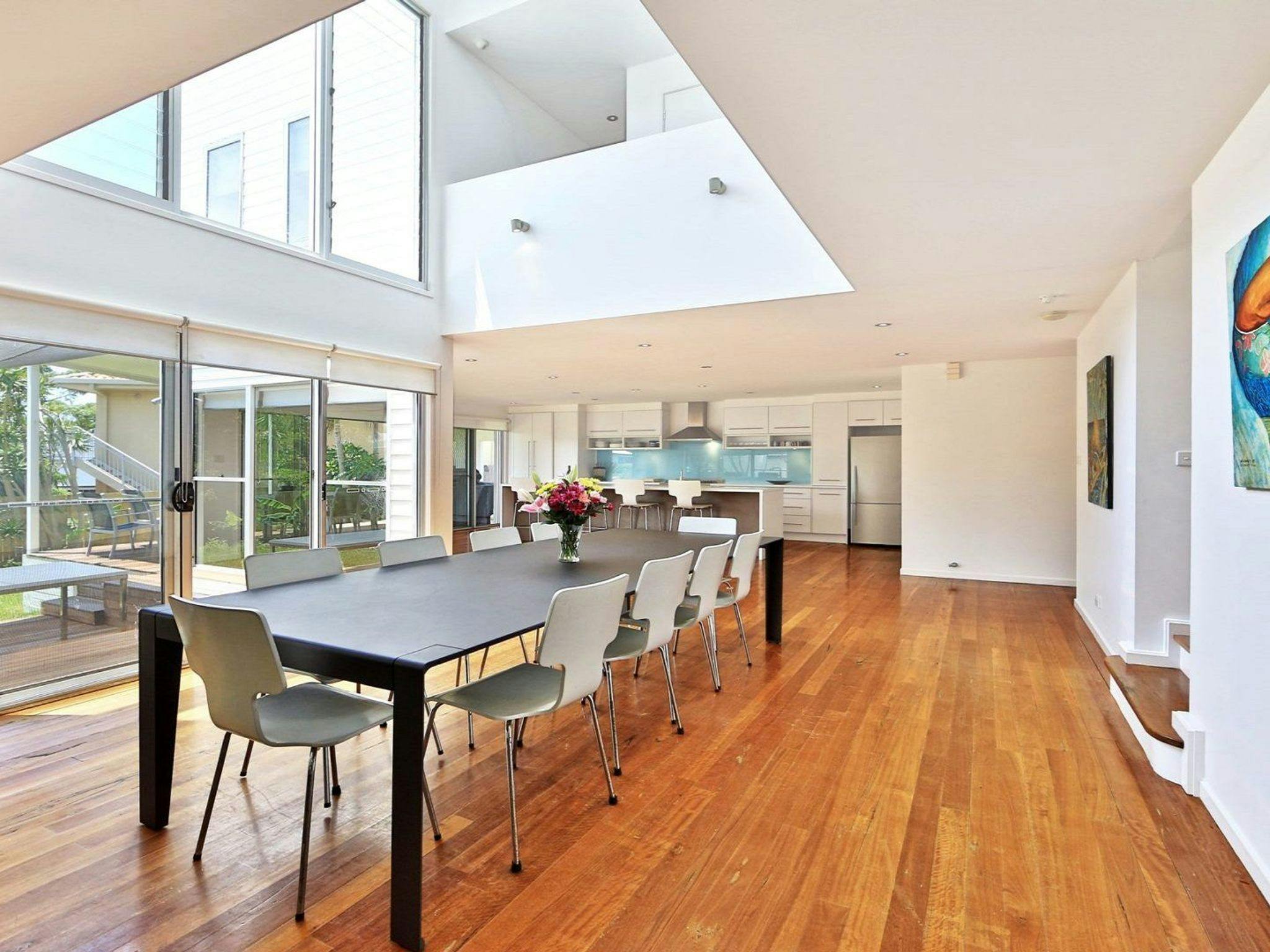 The dining table can seat ten guests, with four seats on the large island kitchen bench. The significant split-level entertaining deck provides the comfort of two six-seater outdoor settings for summer meals.