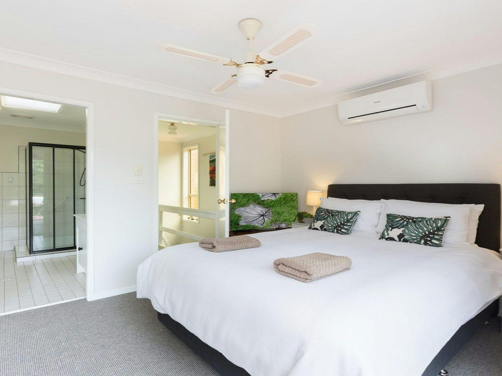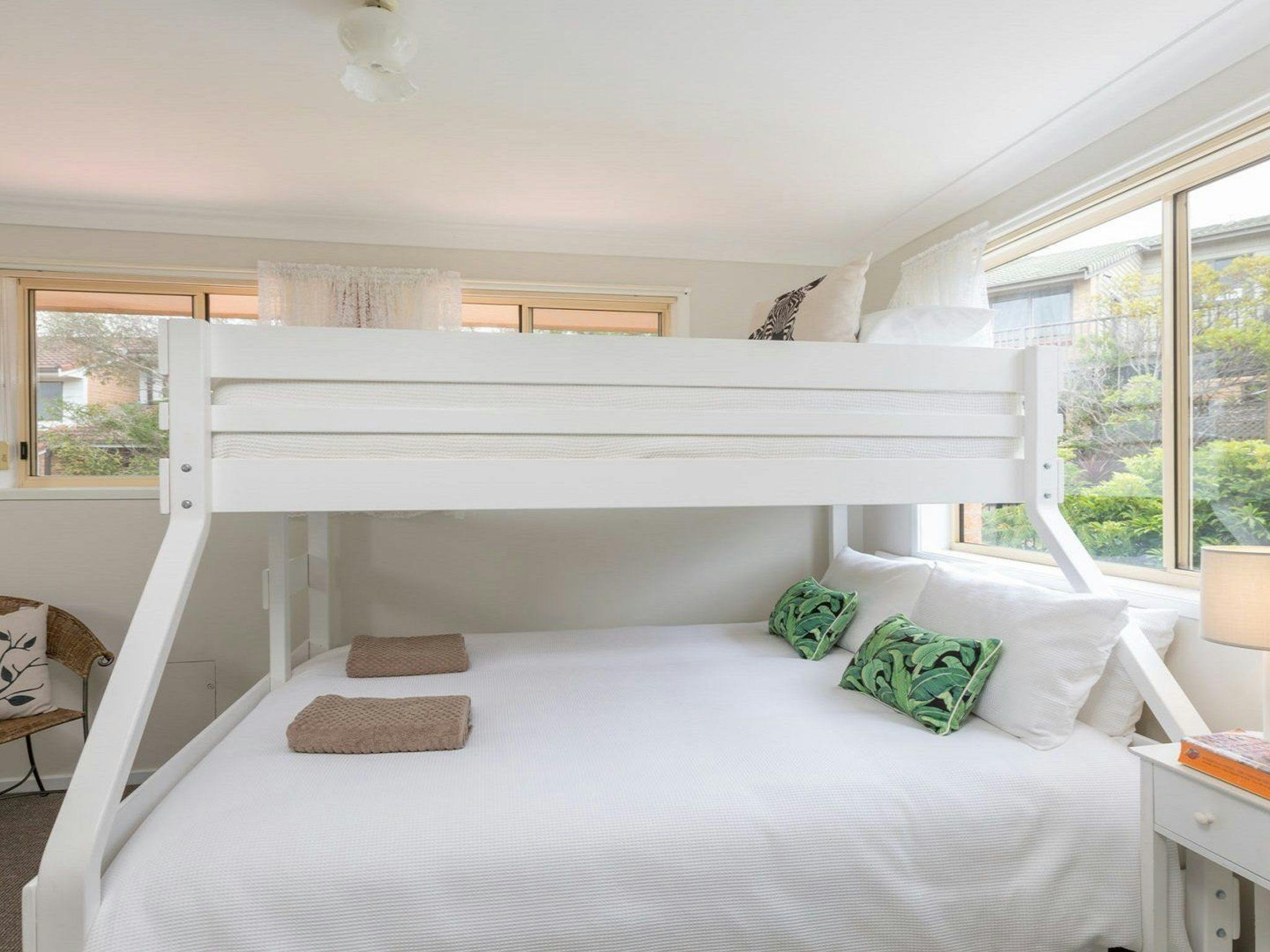 The upper level features two bedrooms, the main with a queen bed and its own full-width balcony. The master also features reverse cycle air conditioning and access to the two-way bathroom. Bedroom two caters to an additional three guests with a tri-bunk, which has a queen bed on the bottom and king single on top. There is a reverse cycle, split system in this room for added comfort.