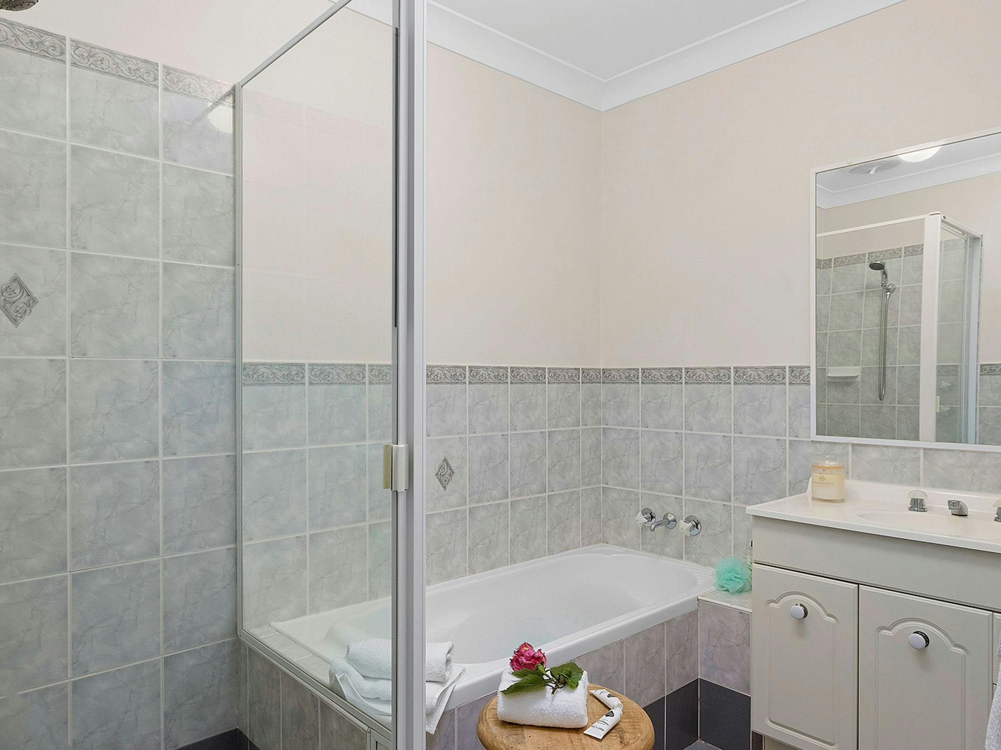 A modern bathroom has a bathtub, shower, vanity and separate toilet. The laundry is equipped with a washing machine and dryer for your convenience.