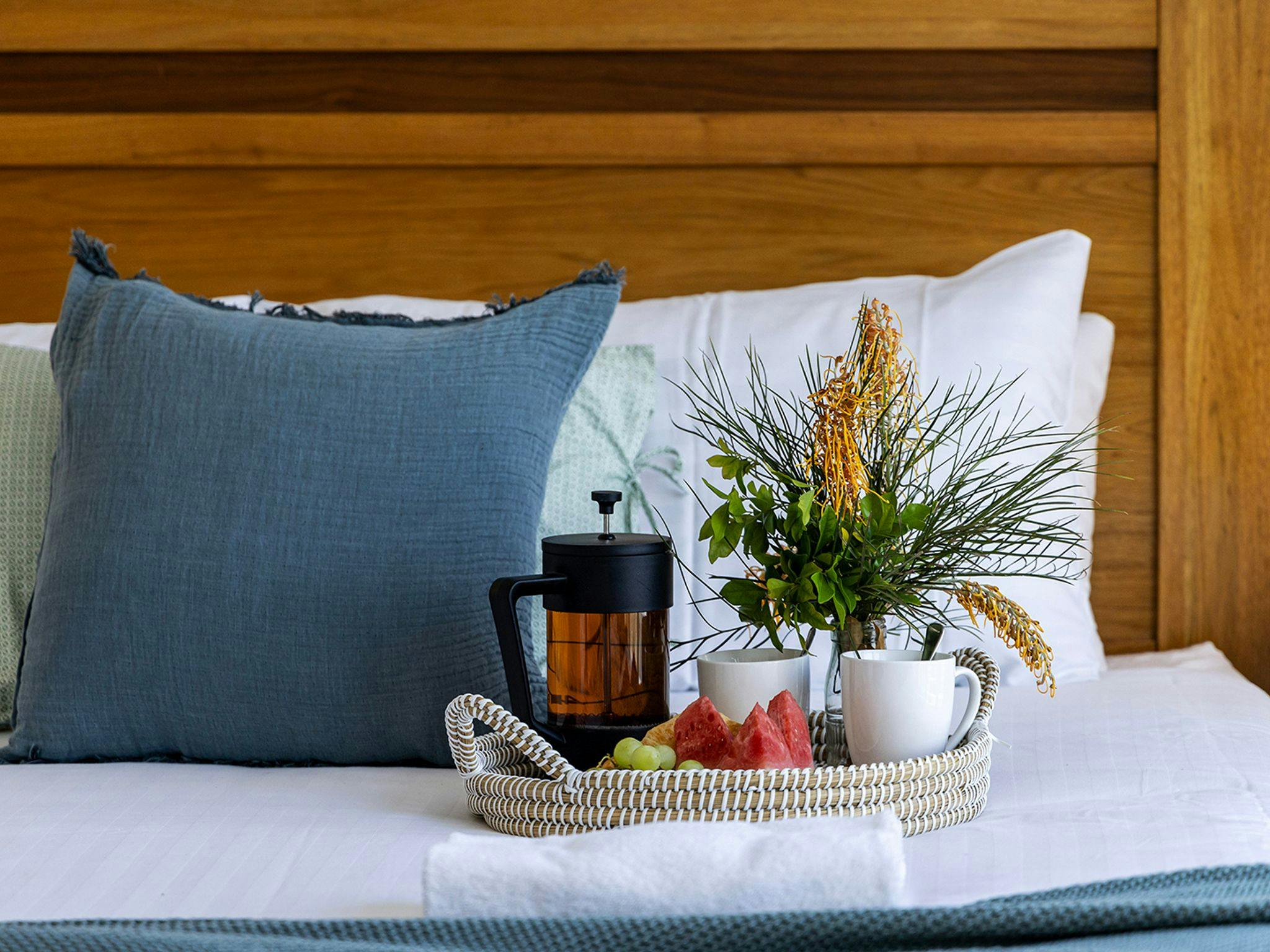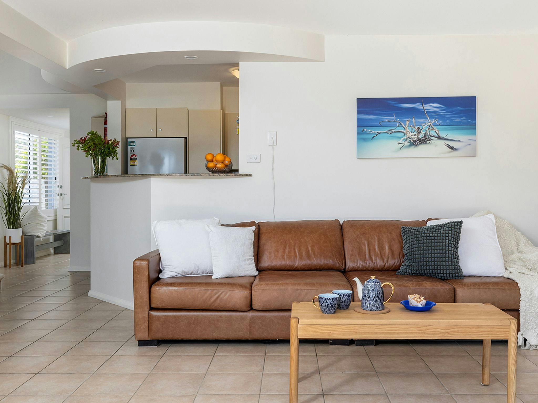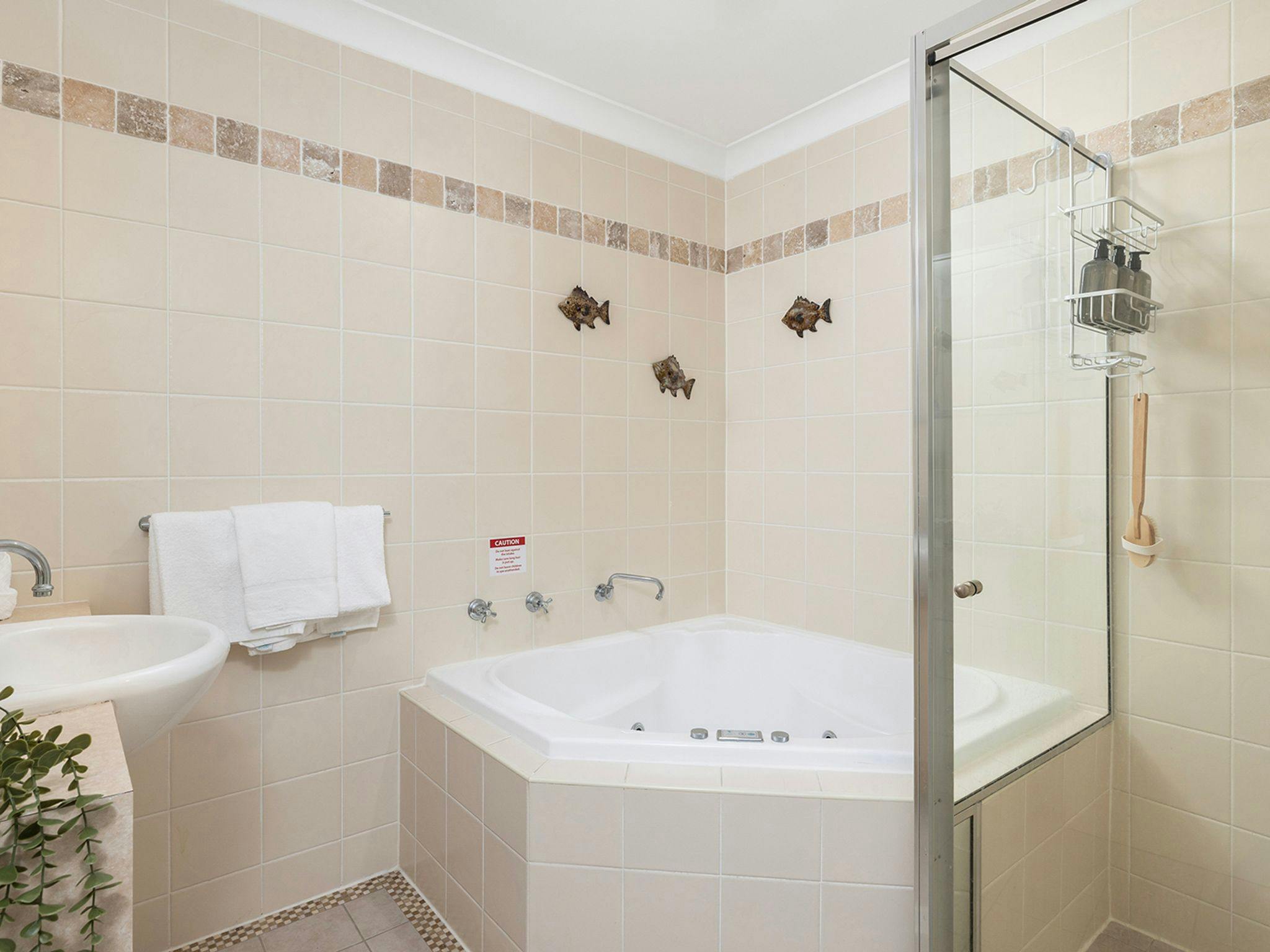 The three bedrooms are thoughtfully appointed, each with French doors opening to private balconies, offering a touch of elegance and a sea breeze from the nearby beach. The upstairs bathroom includes a spa bath, perfect for a long soak after a day of activities