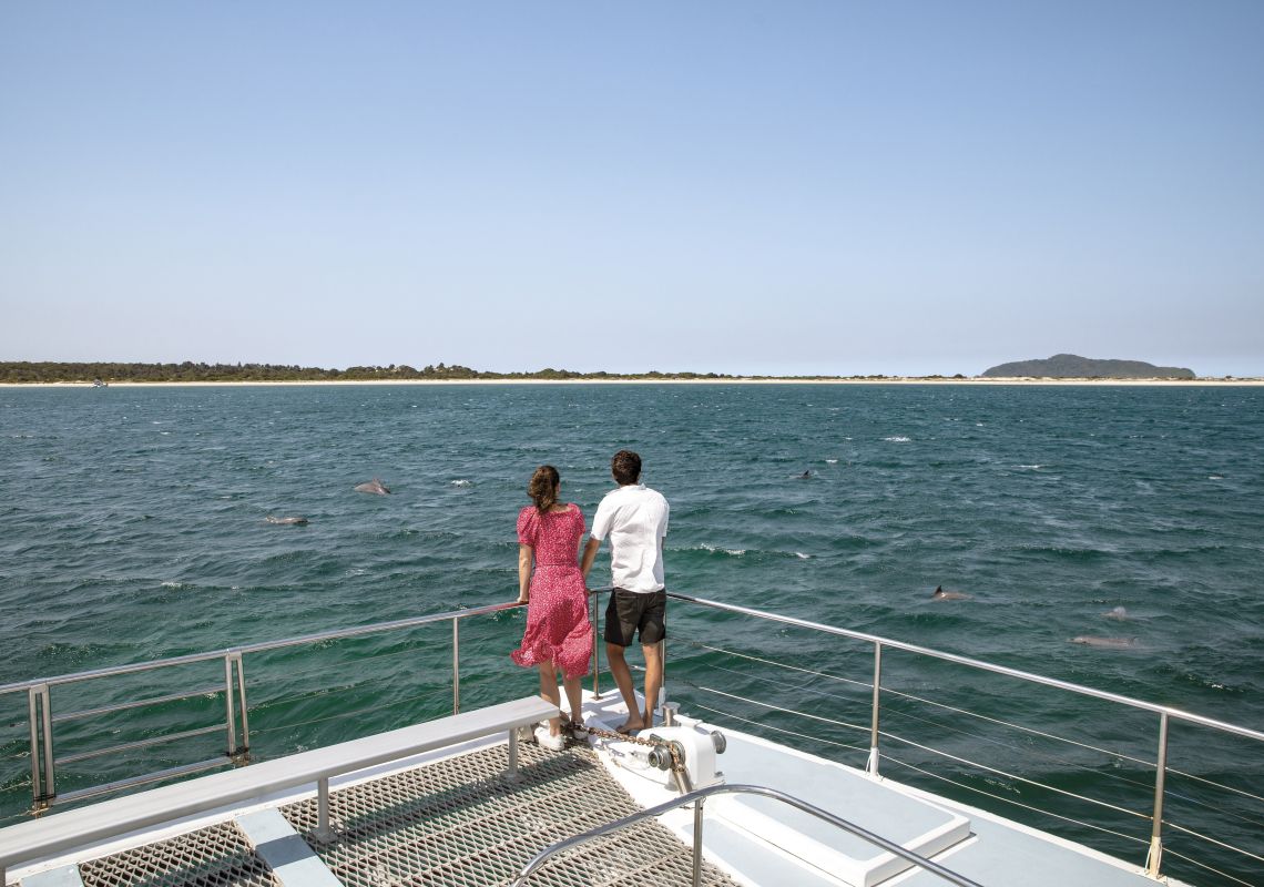 美しいポート・スティーブンスでは、ホエールウォッチングのシーズンならではの壮大な光景を、ホエールウォッチングクルーズから海岸沿いの高台からの展望台まで、様々な方法で楽しむことができます。雄大な哺乳類の美しさを堪能できるだけでなく、ニューサウスウェールズノース・コーストのこの海域には100頭以上のバンドウイルカが生息しており、一年中その姿を見ることができます。