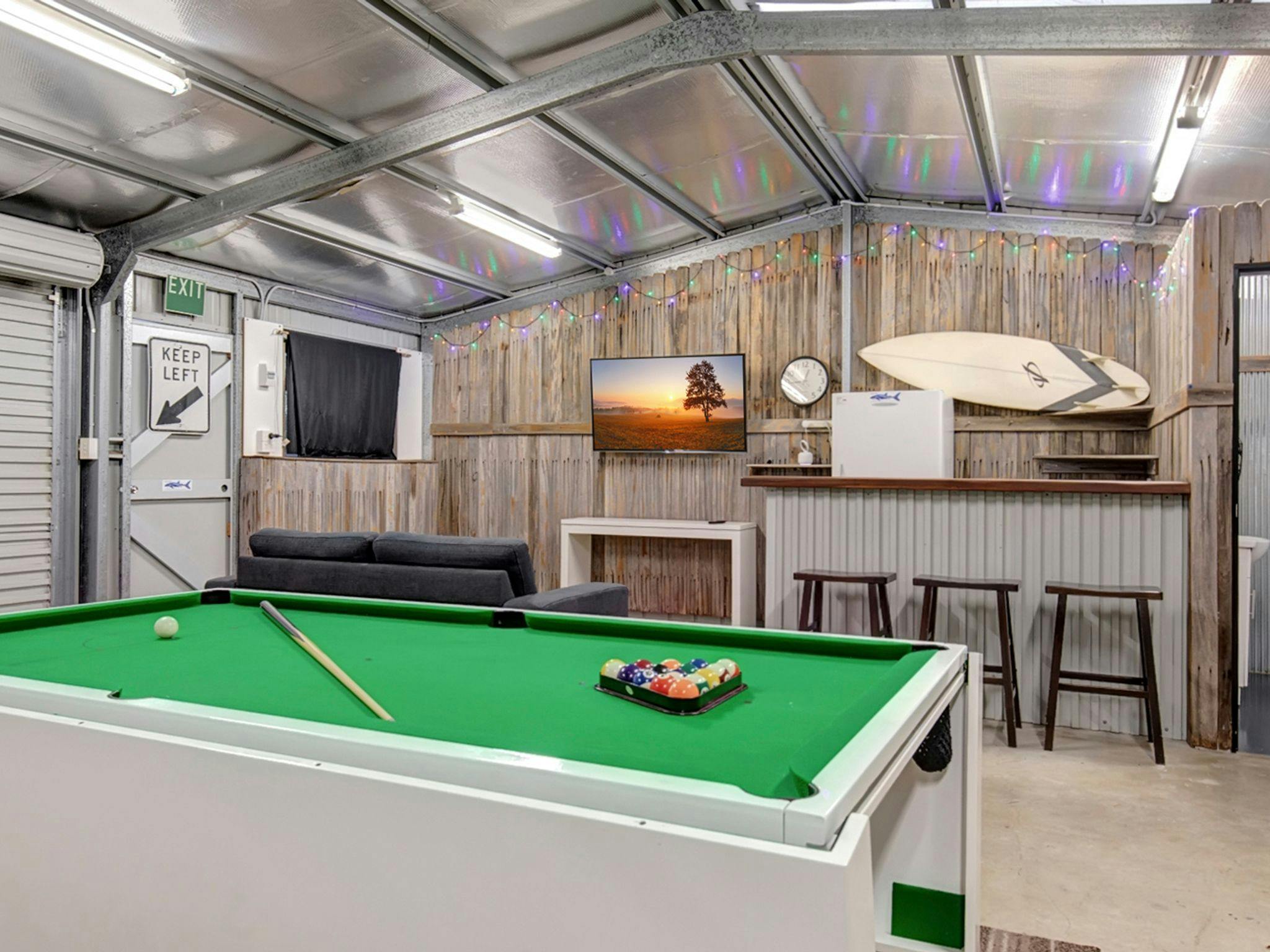 150South has a completely equipped kitchen and barbeque area for alfresco dining and entertaining. A separate pavilion containing a games and entertainment room provides the ultimate hang-out spot. Complete with television, foosball, pool table, fridge, and bar to keep beverages cool while playing.