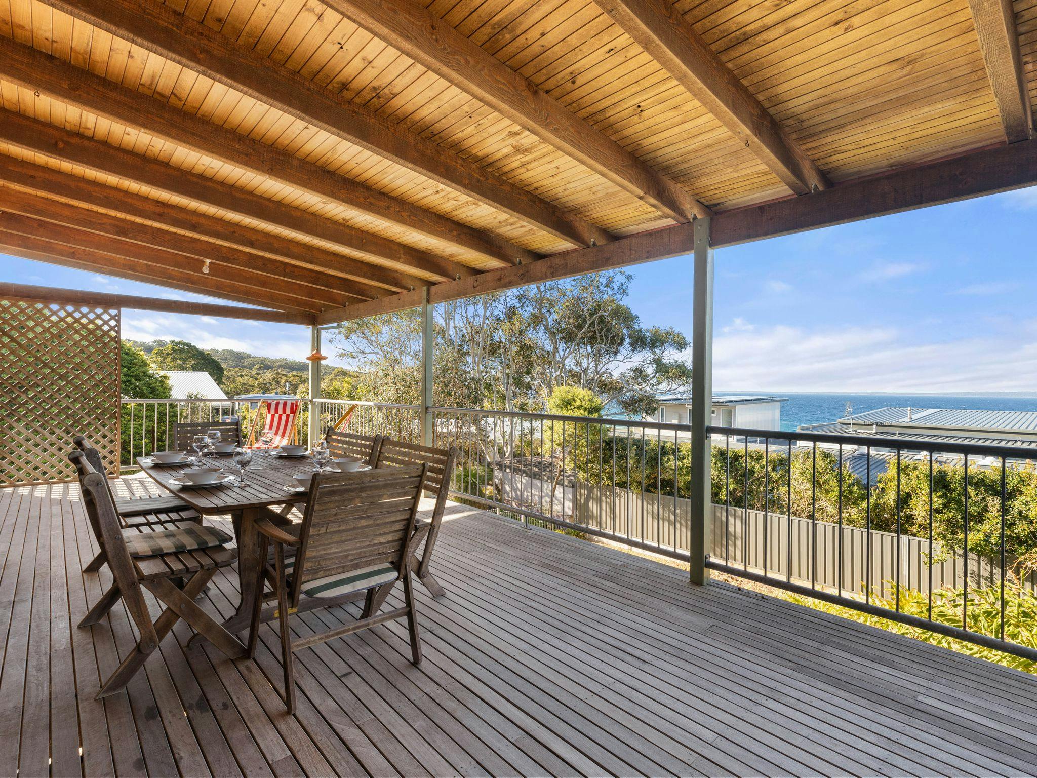 Sleeping arrangements include two double bedrooms upstairs and a queen bed with two singles downstairs. Linen is provided, and the kitchen is well-equipped for meal preparation. Enjoy sweeping ocean views from the spacious balcony or relax in the fully secure backyard.
