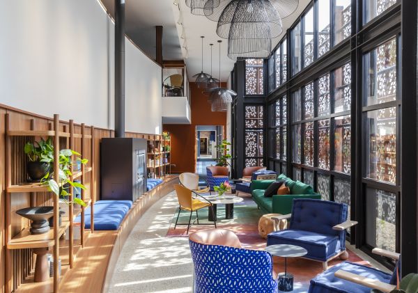 夕方の空気が爽やかな秋の冷え込みを感じながら、アートハウスバーで地元のシラーズを味わいながらくつろぎ、スクールハウスレストラン大胆なモダンビストロの味を提供する。どちらも1857年に建てられた銀行の建物を利用しています。