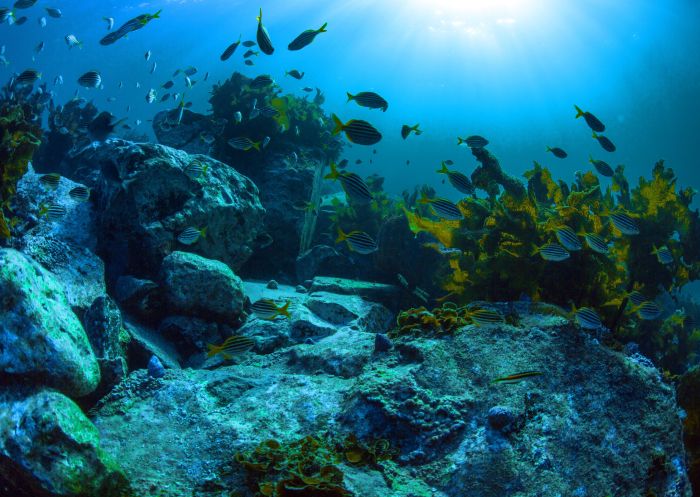 に位置するバスポイント自然保護区ニューサウスウェールズ州サウス・コーストのシェル・ハーバー付近、 ブッシュレンジャーズベイ水生自然保護区円形劇場のような形をしたこの海域は、様々な魚類にとって安全な生息地となっています。ケルプの茂みの上を泳ぎながら、揺れる海藻に巧みにカモフラージュされたウィーディーシードラゴンや、岩の張り出しの下に潜むイースタンブルーデビルを探してみてください。他にも、ブルーグロパー、スムーズスティングレイ、オオコウイカ、オオテンジクザメなどの海洋生物が生息しています。