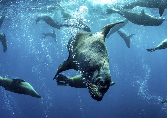 この湾には、遊び心のあるオーストラリアオットセイの群れも生息しており、一緒にシュノーケリングをするといつも楽しいです。また、ボートの後をついてくるイルカの大群もいます。5月から9月にかけては、回遊中のザトウクジラと一緒に泳ぐこともできます。
