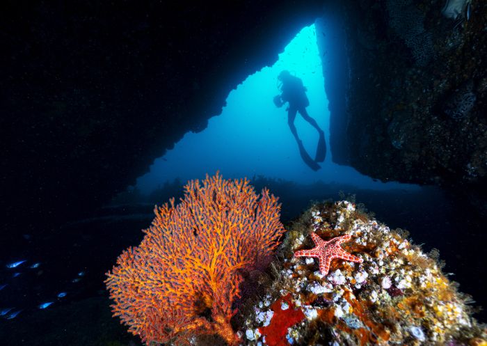 もう一つの素晴らしいダイビングスポットは、オットセイや世界最小のペンギンであるリトルペンギンの生息地であるモンタギュー島です。この島はナルーマから8km沖合にあり、南海岸の美しいユーロボダラ地域の一部です。ツアーのご予約はモンタギュー島ツアーまたは水中サファリ。