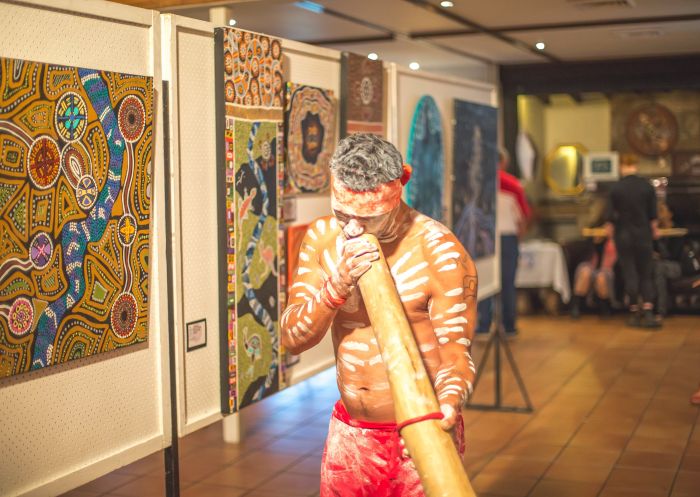 国際的に評価の高いアボリジニの芸術家ロイド・ガウラ・ホーンズビーの邸宅。ガウラギャラリー新進気鋭の先住民のアーティストや著名なアーティストの展覧会も開催しています。ホーンズビーの作品は、ユイン族の夢物語、アボリジニの歴史、そして彼自身の個人的な旅を描いています。そこでは、伝統的な物語のように、自然界と超自然界が一体となるのです。ロイド・ホーンズビーとアーティストのサラ・フレッチャーによる最近のインスタレーションは、ンゴラブル・カントリーとグレン・イネスにとって重要な物語を反映しており、アボリジニの人物やシンボル、そして犬や羊を連れた農夫や市庁舎などを描き、文化間の調和を促進しています。展覧会は8週間ごとに入れ替えられ、館内にはカフェも併設されています。