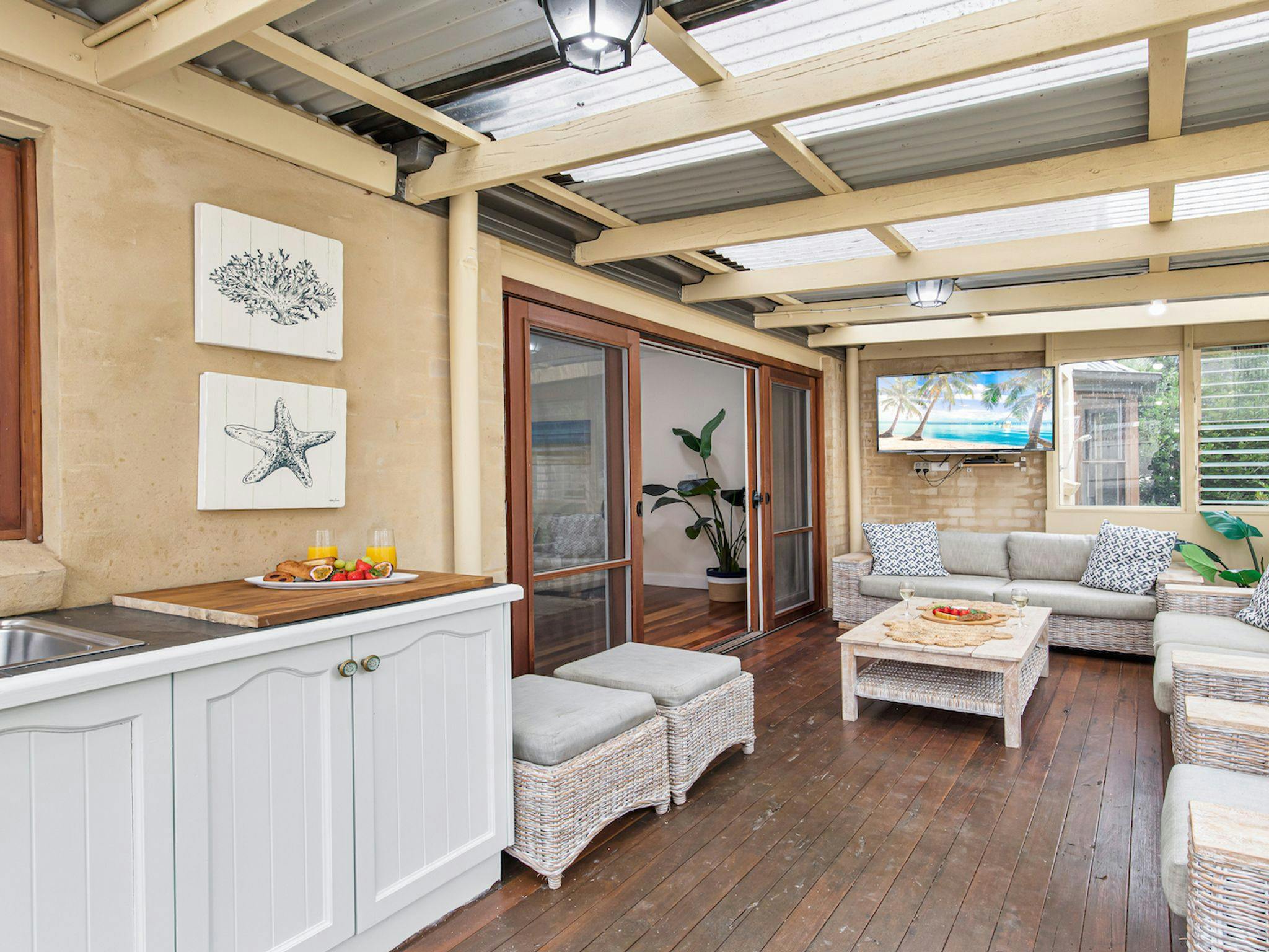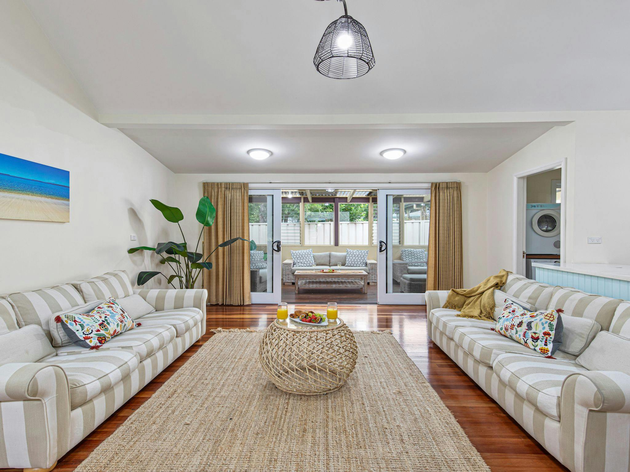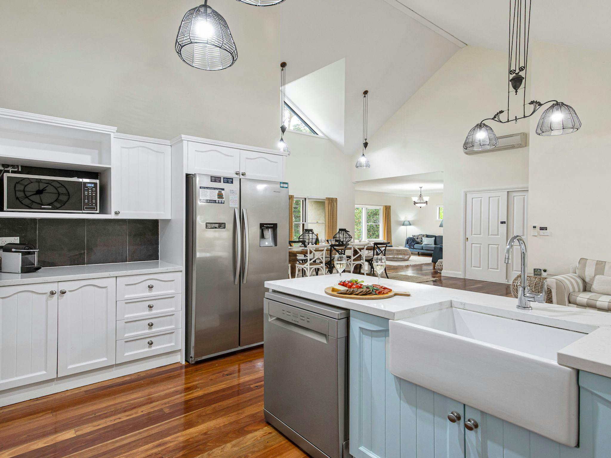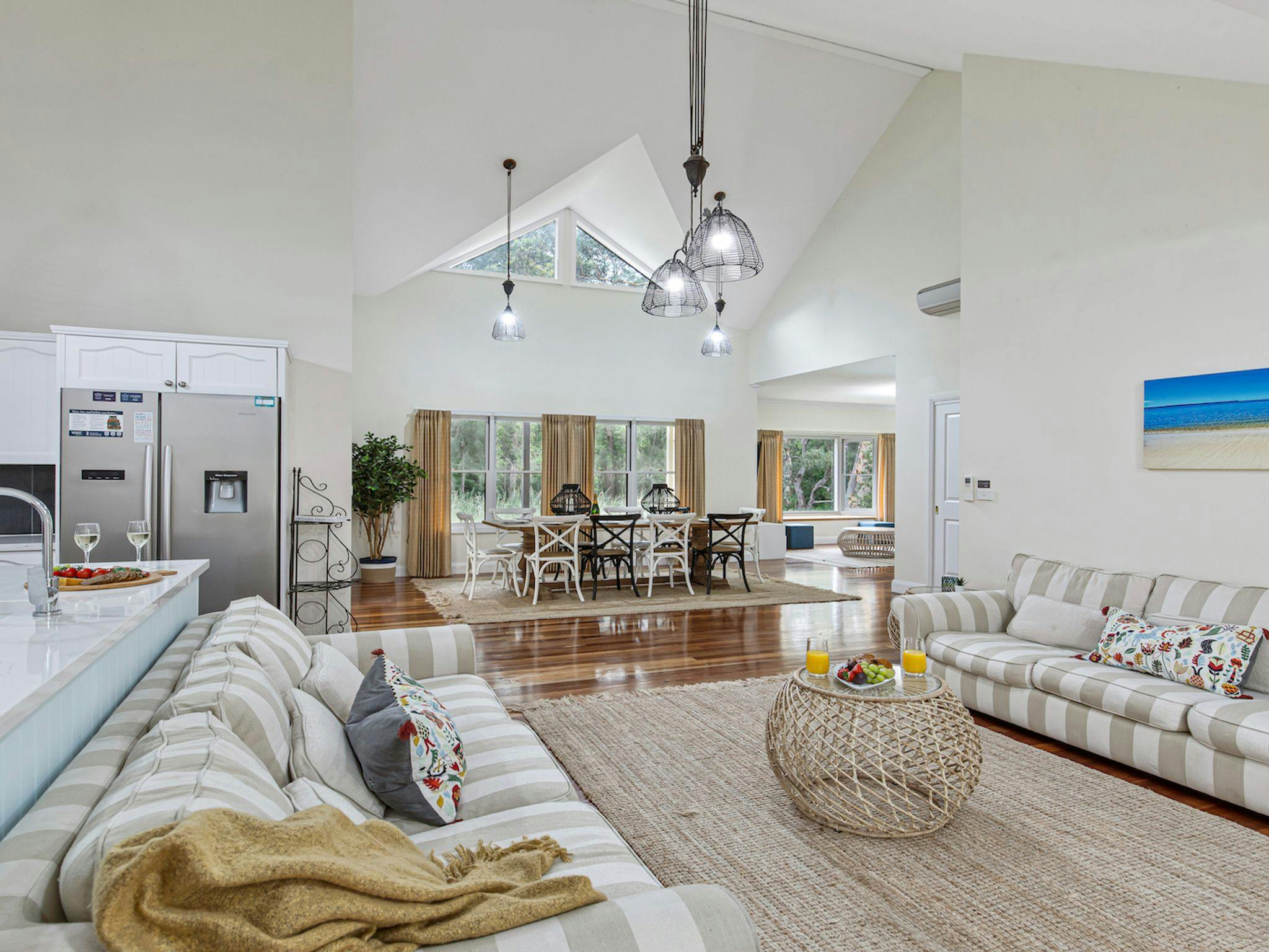 Sandy Shoresは、静かな緑豊かな通りの端に位置し、ジャービス湾の自然のままの海までわずか200メートルです。敷地から向かい側の森林保護区を眺めると、プライバシーと静けさが感じられます。家の中心には、光に満ちたオープンプランのキッチン、リビング、ダイニング エリアがあり、家族や友人とくつろいだりリラックスしたりするのに最適な場所です。この家には、アーチ型の天井、モダンな家具、ネスプレッソ コーヒー マシンを備えた設備の整ったキッチン、薪の暖炉、屋外スパにつながる密閉されたエンターテイメント エリアが備わっています。