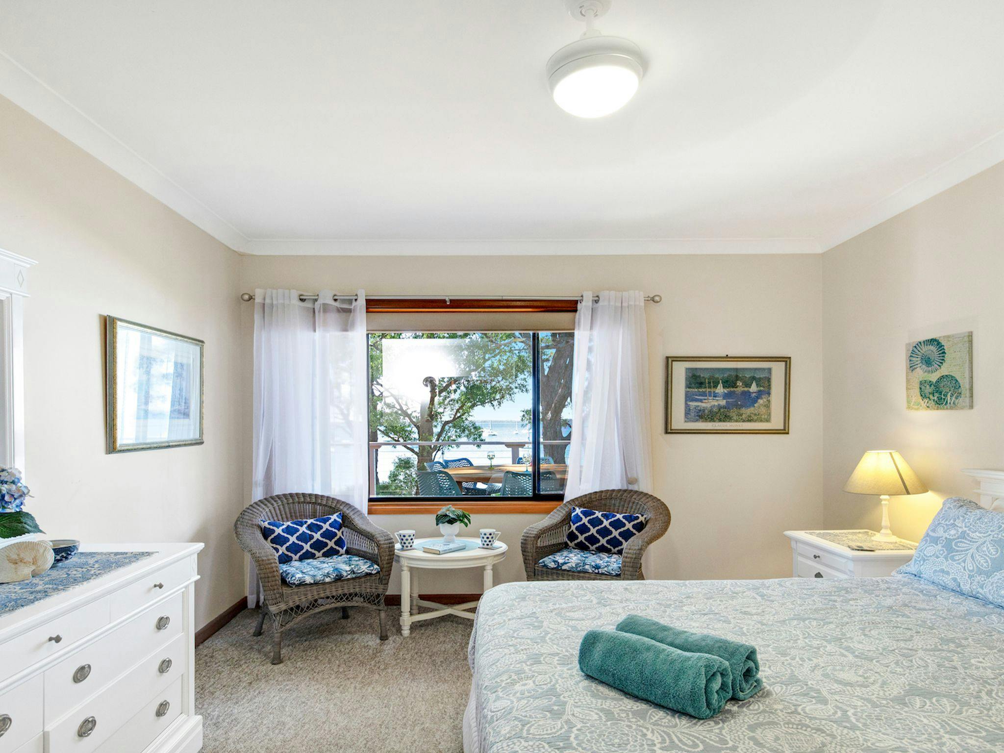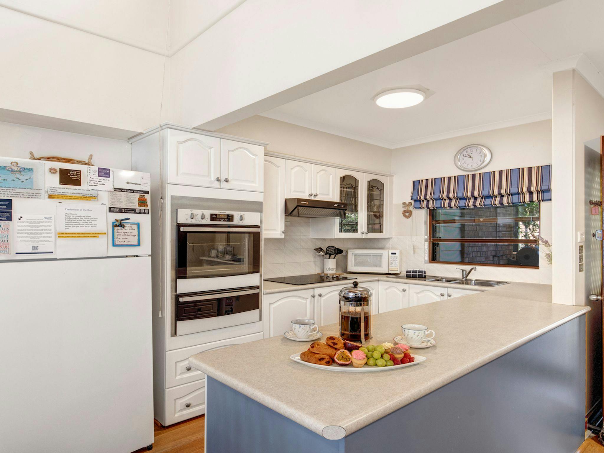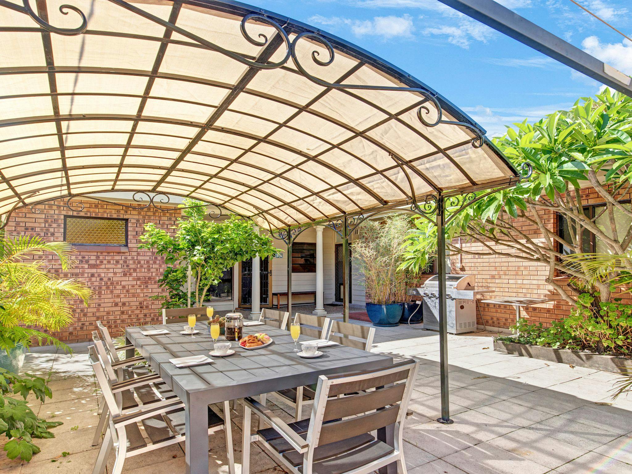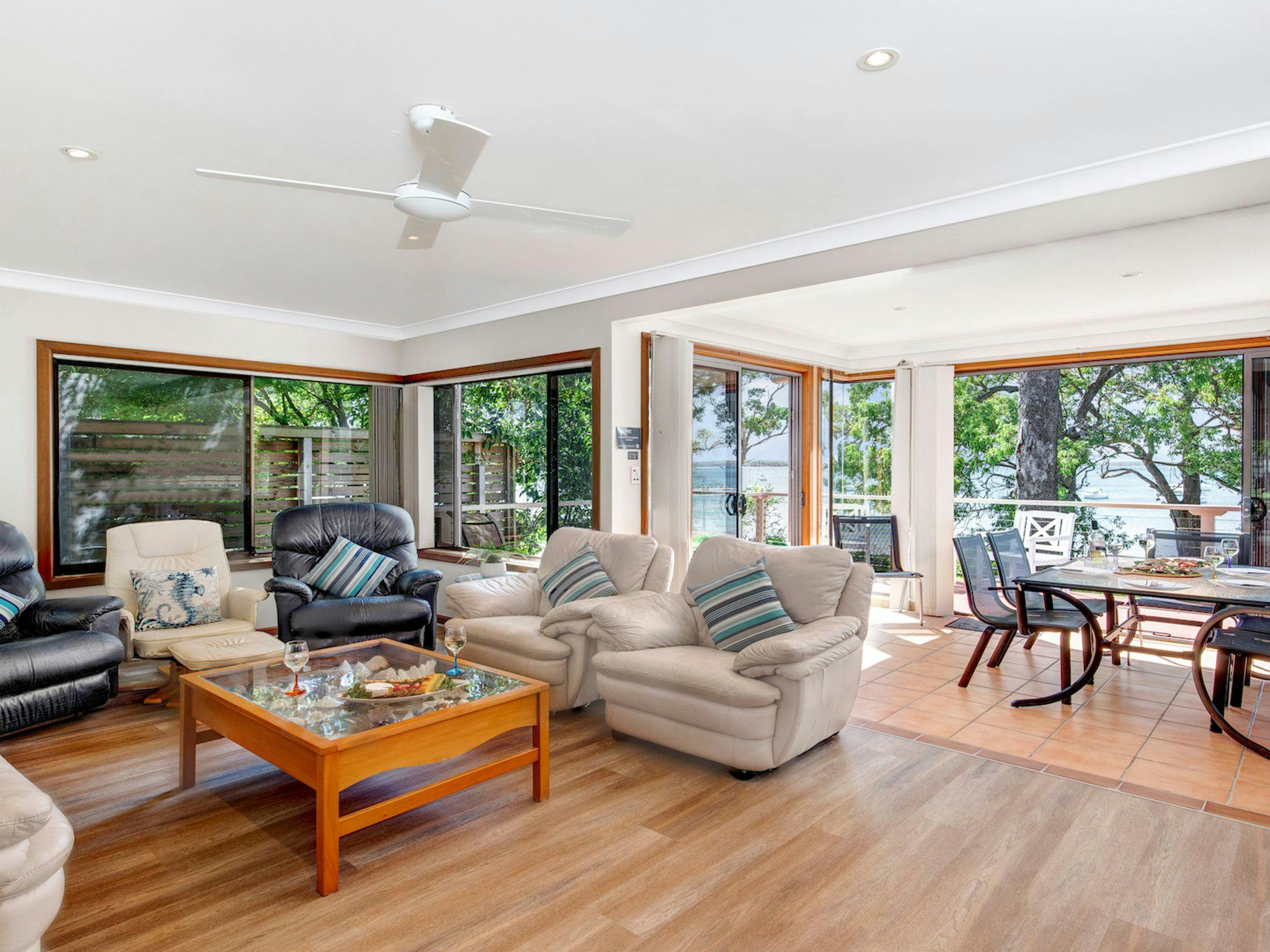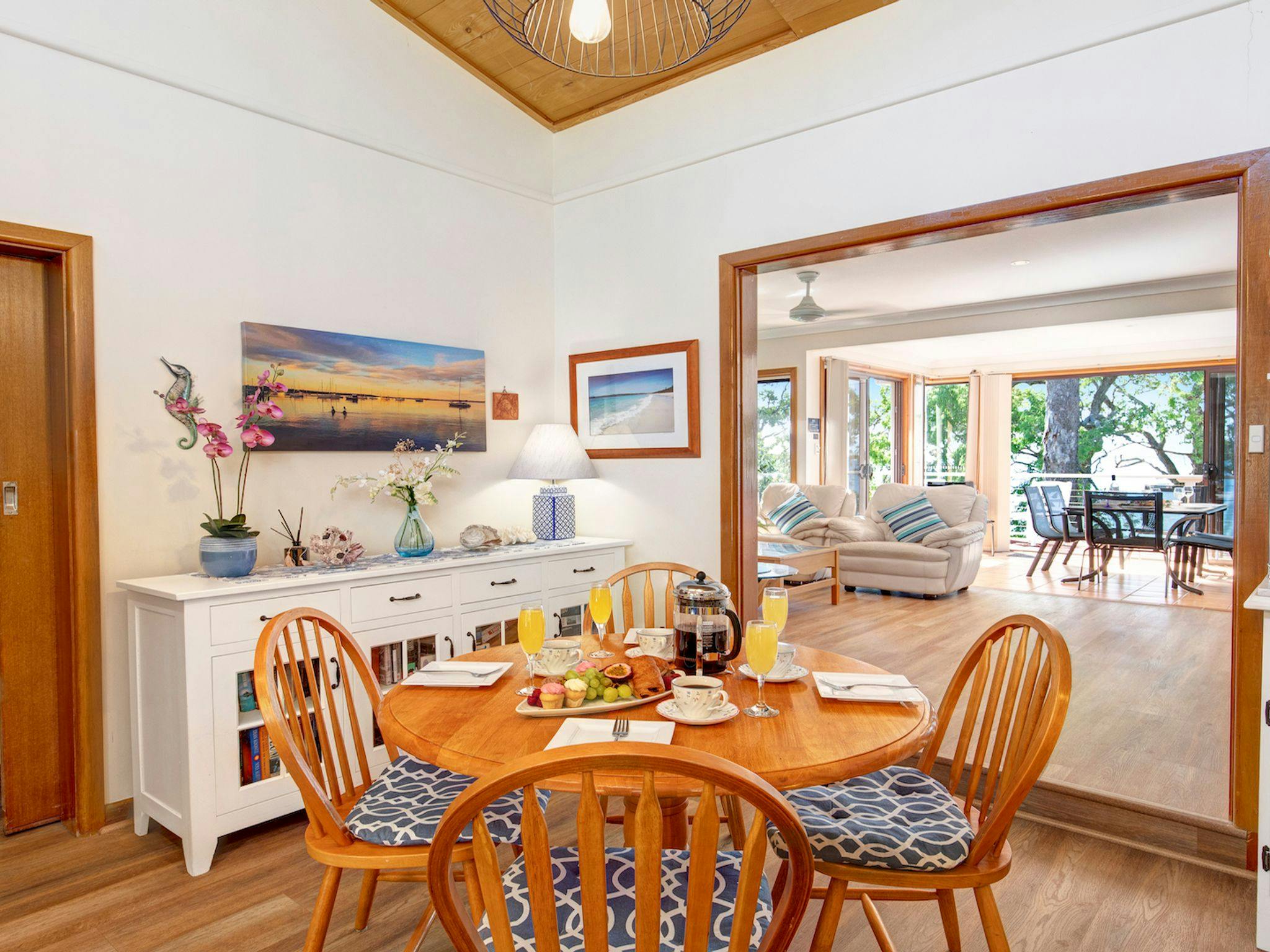 屋内と屋外に十分なリビング エリアがあり、コンパクトですが設備の整ったキッチンには電子レンジと食器洗い機が完備されています。